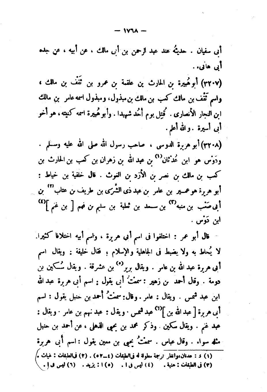 لا يحاط به ولا يضبط فِي الجاهلية والإسلام، فَقَالَ خليفة: ويقال اسم أبي هريرة عَبْد اللَّهِ بْن عامر. ويقال برير [٥] بْن عشرقة. ويقال سكين بْن دومة. وَقَالَ أَحْمَد بْن زهير: سمعت أبي يقول: اسم أبي هريرة عبد الله ابن عبد شمس. ويقال: عامر. وَقَالَ: سمعت أَحْمَد بْن حنبل يقول: اسم أبي هريرة [عَبْد اللَّهِ بْن] [٦] عبد شمس. ويقال: عبد نهم بْن عامر. ويقال: