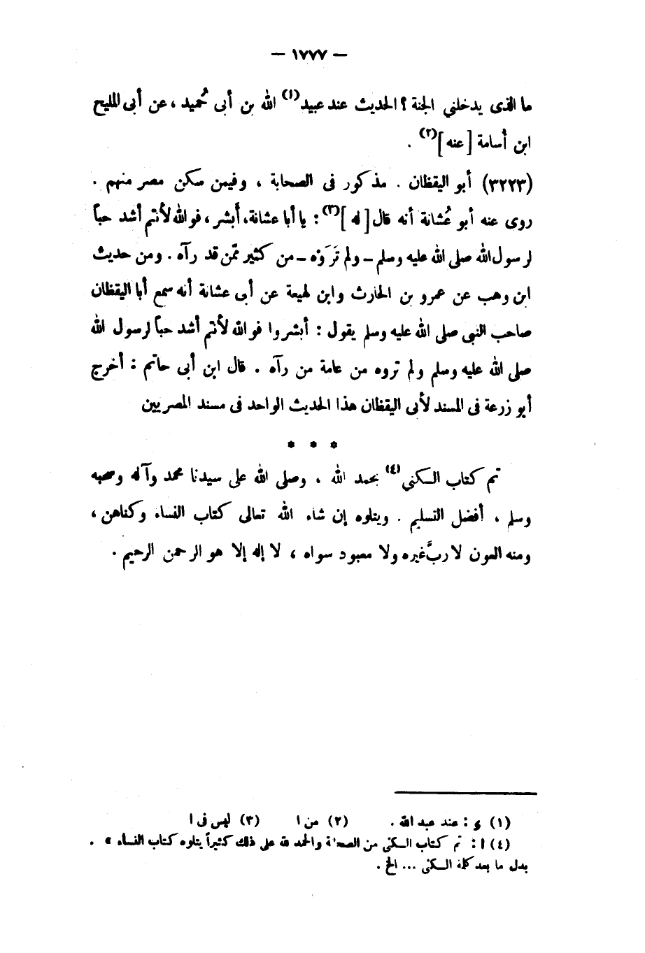 روى عنه أَبُو عشانة أنه قال [له] [٣] : يا أبا عشانة، أبشر، فو الله لأنتم أشد حبا لرسول الله صلى الله عَلَيْهِ وَسَلَّمَ- ولم تروه- من كثير ممن قد رآه. وَمِنْ حَدِيثِ ابْنِ وَهْبٍ عَنْ عَمْرِو بْنِ الْحَارِثِ وَابْنِ لَهِيعَةَ عَنْ أَبِي عُشَانَةَ أَنَّهُ سَمِعَ أَبَا الْيَقْظَانِ صَاحِبَ النَّبِيِّ صلى الله عليه وسلم يقول: أبشروا فو الله لأنتم أشد حبا لرسول الله صلى الله عَلَيْهِ وَسَلَّمَ وَلَمْ تَرَوْهُ مِنْ عَامَّةِ مَنْ رَآهُ. قَالَ ابْنُ أَبِي حَاتِمٍ: أَخْرَجَ أَبُو زُرْعَةَ فِي الْمُسْنَدِ لأَبِي الْيَقْظَانِ هَذَا الْحَدِيثَ الواحد في مسند المصريين تم كتاب الكنى [٤] بحمد الله، وصلى الله على سيدنا محمد وآله وصحبه وسلم، أفضل التسليم. ويتلوه إن شاء الله تعالى كتاب النساء وكناهن، ومنه العون لا ربّ غيره ولا معبود سواه، لا إله إلا هو الرحمن الرحيم.