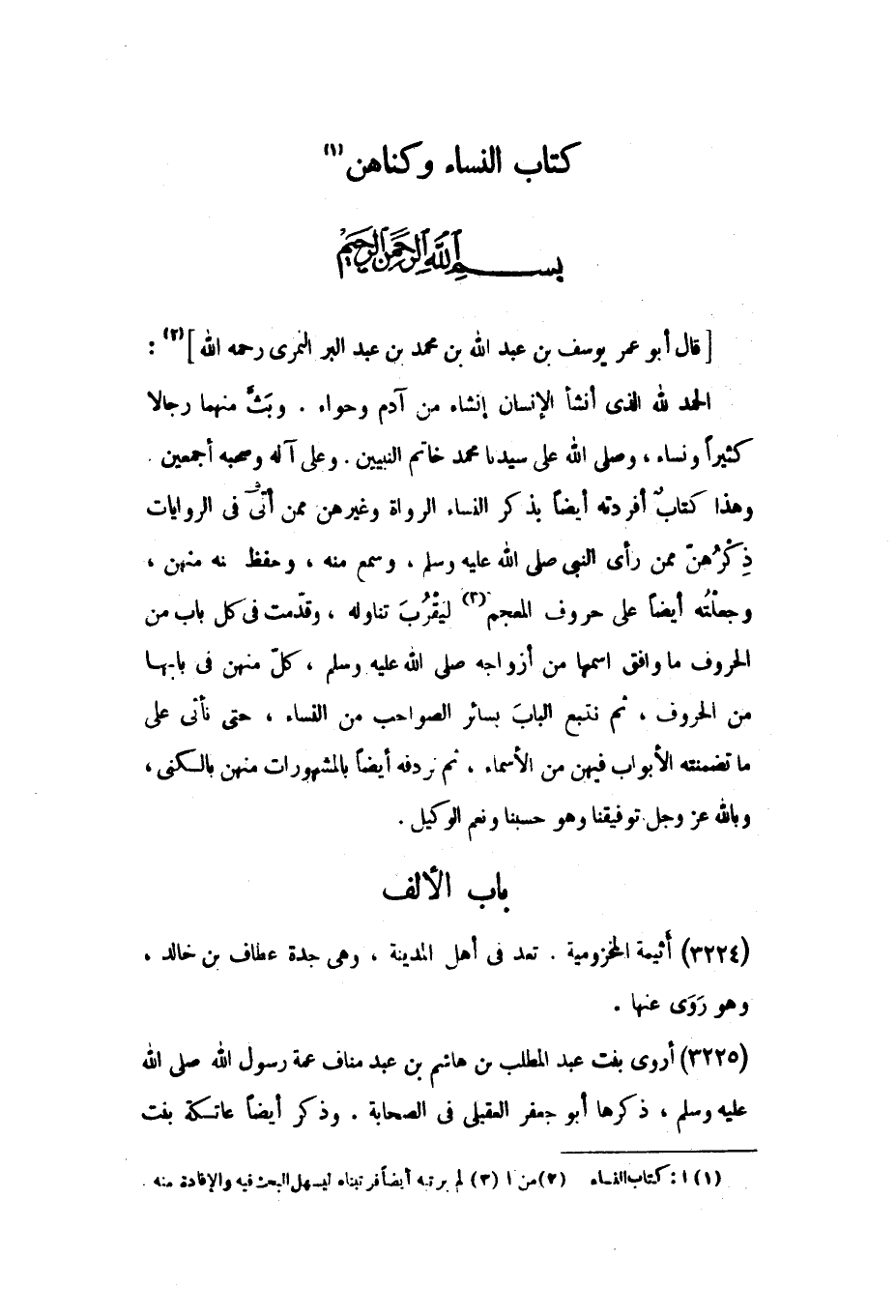 الحمد للَّه الَّذِي أنشأ الإنسان إنشاء من آدم وحواء. وبث منهما رجالًا كثيرًا ونساء، وصلى اللَّه عَلَى سيدنا مُحَمَّد خاتم النبيين. وعلى آله وصحبه أجمعين وهذا كتاب أفردته أَيْضًا بذكر النساء الرواة وغيرهن ممن أتى فِي الروايات ذكرهن ممن رأى النَّبِيّ صَلَّى اللَّهُ عَلَيْهِ وَسَلَّمَ، وسمع منه، وحفظ عنه منهن، وجعلته أَيْضًا عَلَى حروف المعجم [٣] ليقرب تناوله، وقدمت فِي كل باب من الحروف مَا وافق اسمها من أزواجه صَلَّى اللَّهُ عَلَيْهِ وَسَلَّمَ، كل منهن فِي بابها من الحروف، ثم نتبع الباب بسائر الصواحب من النساء، حَتَّى نأتي عَلَى مَا تضمنته الأبواب فيهن من الأسماء، ثم نردفه أَيْضًا بالمشهورات منهن بالكنى، وباللَّه عَزَّ وَجَلَّ توفيقنا وَهُوَ حسبنا ونعم الوكيل.