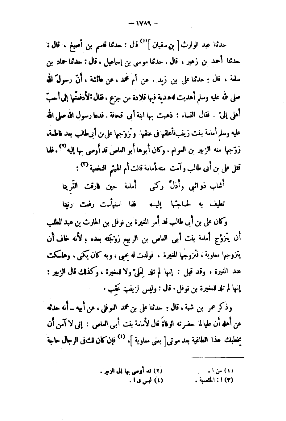 حدثنا أحمد بن زُهَيْرٍ، قَالَ. حَدَّثَنَا مُوسَى بْنُ إِسْمَاعِيلَ، قَالَ: حَدَّثَنَا حَمَّادُ بْنُ سَلَمَةَ، قَالَ: حَدَّثَنَا عَلِيُّ بْنُ زَيْدٍ. عَنْ أُمِّ مُحَمَّدٍ، عَنْ عَائِشَةَ، أن رسول الله صلى الله عليه وسلم أُهْدِيَتْ لَهُ هَدِيَّةٌ فِيهَا قِلادَةٌ مِنْ جَزْعٍ، فَقَالَ: لأَدْفَعَنَّهَا إِلَى أَحَبِّ أَهْلِي إِلَيَّ. فَقَالَ النِّسَاءُ: ذَهَبَتْ بِهَا ابْنَةُ أَبِي قُحَافَةَ. فَدَعَا رسول الله صلى الله عليه وسلم أمامة بِنْتُ زَيْنَبَ فَأَعْلَقَهَا فِي عُنُقِهَا. وَتَزَوَّجَهَا عَلِيُّ بْنُ أَبِي طَالِبٍ بَعْدَ فَاطِمَةَ، زَوَّجَهَا مِنْهُ الزُّبَيْرُ بْنُ الْعَوَّامِ، وَكَانَ أَبُوهَا أَبُو الْعَاصِ قَدْ أَوْصَى بِهَا إِلَيْهِ [٢] ، فَلَمَّا قُتِلَ عَلِيُّ بْنُ أَبِي طَالِبٍ وَآمَتْ مِنْهُ أُمَامَةُ قَالَتْ أُمُّ الْهَيْثَمِ النَّخَعِيَّةُ [٣] :
