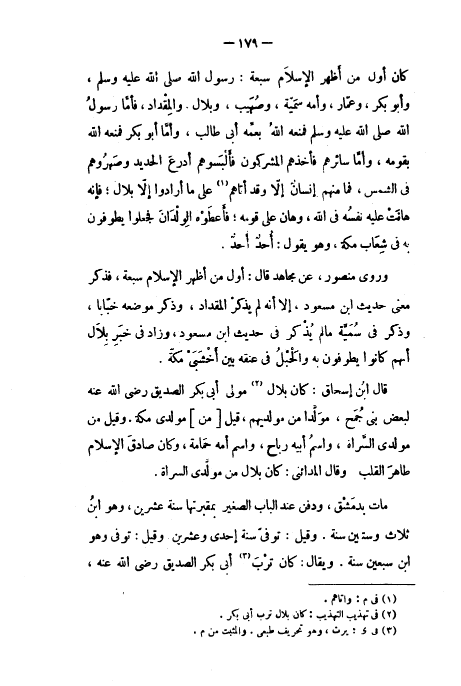 كَانَ أَوَّلُ مَنْ أَظْهَرَ الإِسْلامَ سبَعَةٌ: رَسُولُ الله صلى الله عليه وسلم، وأبو بكر، وَعَمَّارٌ، وَأُمُّهُ سُمَيَّةُ، وَصُهَيْبٌ، وَبِلالٌ، وَالْمِقْدَادُ، فَأَمَّا رَسُولُ اللَّهِ صَلَّى اللَّهُ عَلَيْهِ وَسَلَّمَ فَمَنَعَهُ اللَّهُ بِعَمِّهِ أَبِي طَالِبٍ، وَأَمَّا أَبُو بَكْرٍ فَمَنَعَهُ اللَّهُ بِقَوْمِهِ، وَأَمَّا سَائِرُهُمْ فَأَخَذَهُمُ الْمُشْرِكُونَ فَأَلْبَسُوهُمْ أَدْرُعَ الْحَدِيدِ وَصَهَرُوهُمْ فِي الشَّمْسِ، فَمَا مِنْهُمْ إِنْسَانٌ إِلا وَقَدْ أَتَاهُمْ [١] عَلَى مَا أَرَادُوا إِلا بِلالٌ، فَإِنَّهُ هَانَتْ عَلَيْهِ نَفْسُهُ فِي اللَّهِ، وَهَانَ عَلَى قَوْمِهِ، فَأَعْطَوْهُ الْوِلْدَانَ فَجَعَلُوا يَطُوفُونَ بِهِ فِي شِعَابِ مَكَّةَ، وَهُوَ يقول: أحد أحد.