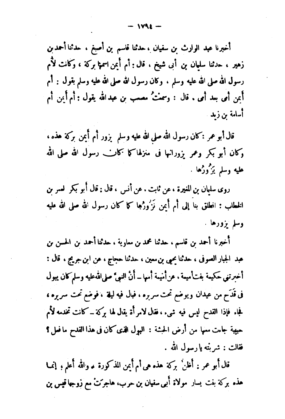 أخبرنا عبد الوارث بن سفيان، حدثنا قاسم بن أصبغ، حدثنا أحمد بن زهير، حدثنا سُلَيْمَانُ بْنُ أَبِي شَيْخٍ، قَالَ: أُمُّ أَيْمَنَ اسْمُهَا بَرَكَةُ، وَكَانَتْ لأُمِّ رَسُولِ اللَّهِ صَلَّى الله عليه وسلم، وكان رسول الله صلى اللَّهُ عَلَيْهِ وَسَلَّمَ يَقُولُ: أُمُّ أَيْمَنَ أُمِّي بَعْدَ أُمِّي، قَالَ: وَسَمِعْتُ مُصْعَبَ بْنَ عَبْدِ اللَّهِ يَقُولُ: أُمُّ أَيْمَنَ أُمُّ أُسَامَةَ بْنِ زَيْدٍ.