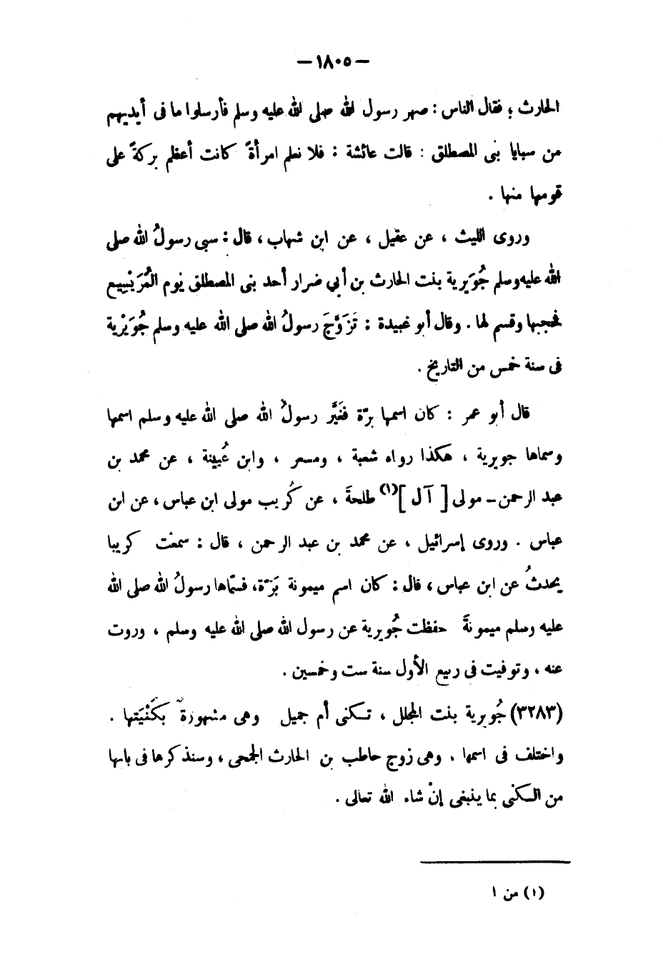 قَالَ أَبُو عُمَرَ: كَانَ اسْمُهَا بَرَّةَ فَغَيَّرَ رَسُولُ اللَّهِ صَلَّى اللَّهُ عَلَيْهِ وَسَلَّمَ اسْمَهَا وَسَمَّاهَا جُوَيْرِيَةَ، هَكَذَا رَوَاهُ شُعْبَةُ، وَمِسْعَرٌ، وَابْنُ عُيَيْنَةَ، عَنْ مُحَمَّدِ بْنِ عَبْدِ الرَّحْمَنِ- مَوْلَى [آلِ] [١] طَلْحَةَ، عَنْ كُرَيْبٍ مَوْلَى ابْنِ عَبَّاسٍ، عَنِ ابْنِ عَبَّاسٍ. وَرَوَى إِسْرَائِيلُ، عَنْ مُحَمَّدِ بْنِ عَبْدِ الرَّحْمَنِ، قَالَ: سَمِعْتُ كُرَيْبًا يُحَدِّثُ عَنِ ابْنِ عَبَّاسٍ، قال: كان اسم ميمونة برة، فسماها رسول اللَّهِ صَلَّى اللَّهُ عَلَيْهِ وَسَلَّمَ مَيْمُونَةَ حَفِظَتْ جُوَيْرِيَةُ عَنْ رَسُولِ اللَّهِ صَلَّى اللَّهُ عَلَيْهِ وَسَلَّمَ، وَرَوَتْ عَنْهُ، وَتُوُفِّيَتْ فِي رَبِيعٍ الأَوَّلِ سنة ست وخمسين.