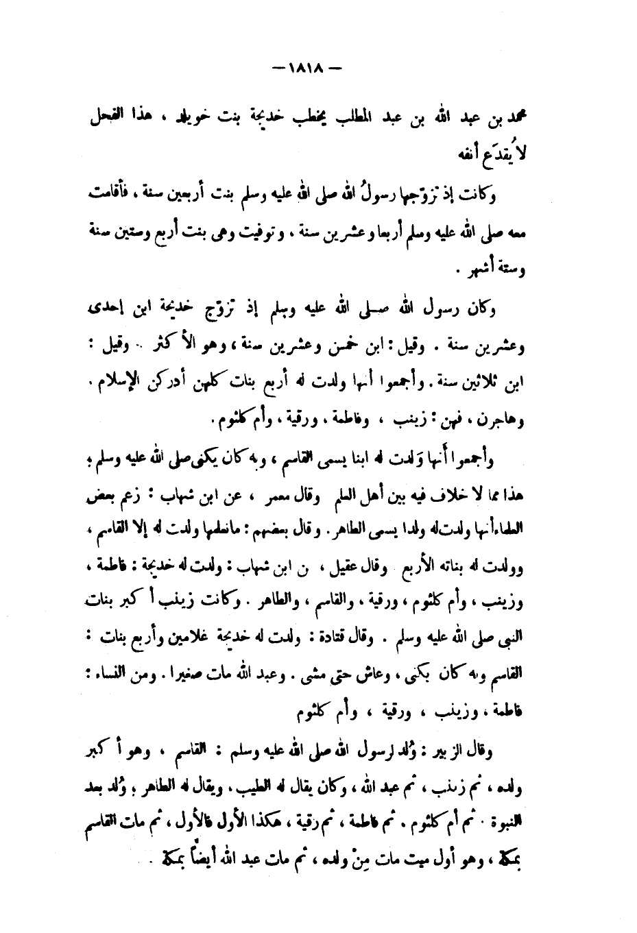 محمد بن عبد الله بن عبد المطلب يخطب خديجة بنت خويلد، هَذَا الفحل لا يقدع أنفه وكانت إذ تزوجها رَسُول اللَّهِ صَلَّى اللَّهُ عَلَيْهِ وَسَلَّمَ بنت أربعين سنة، فأقامت معه صَلَّى اللَّهُ عَلَيْهِ وَسَلَّمَ أربعًا وعشرين سنة، وتوفيت وهي بنت أربع وستين سنة وستة أشهر.
