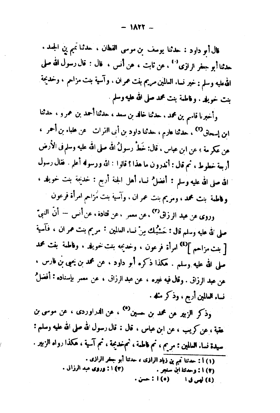 قَالَ أَبُو دَاوُدَ: حَدَّثَنَا يُوسُفُ بْنُ مُوسَى الْقَطَّانُ، حَدَّثَنَا تَمِيمُ بْنُ الْجَعْدِ، حَدَّثَنَا أَبُو جَعْفَرٍ الرَّازِيُّ [١] ، عَنْ ثَابِتٍ، عَنْ أَنَسٍ، قَالَ: قال رسول الله صلى الله عليه وسلم: خَيْرُ نِسَاءِ الْعَالَمِينَ مَرْيَمُ بِنْتُ عِمْرَانَ، وَآسِيَةُ بِنْتُ مُزَاحِمٍ، وَخَدِيجَةُ بِنْتُ خُوَيْلِدٍ، وَفَاطِمَةُ بِنْتُ مُحَمَّدٍ صَلَّى اللَّهُ عَلَيْهِ وَسَلَّمَ. وَأَخْبَرَنَا قَاسِمُ بن محمد، حدثنا خالد بن سعد، حدثنا أَحْمَدُ بْنُ عَمْرٍو، حَدَّثَنَا ابْنُ إِسْحَاقَ [٢] ، حَدَّثَنَا عَارِمٌ، حَدَّثَنَا دَاوُدُ بْنُ أَبِي الْفُرَاتِ عَنْ علباء بن أحمر، عن عكرمة، عن ابن عَبَّاسٍ، قَالَ: خَطَّ رَسُولُ اللَّهِ صَلَّى اللَّهُ عَلَيْهِ وَسَلَّمَ فِي الأَرْضِ أَرْبَعَةَ خُطُوطٍ، ثُمَّ قَالَ: أَتَدْرُونَ مَا هَذَا؟ قَالُوا: اللَّهُ وَرَسُولُهُ أَعْلَمُ. فَقَالَ رَسُولُ اللَّهِ صَلَّى اللَّهُ عَلَيْهِ وَسَلَّمَ: أَفْضَلُ نِسَاءِ أَهْلِ الْجَنَّةِ أَرْبَعٌ: خَدِيجَةُ بِنْتُ خُوَيْلِدٍ، وَفَاطِمَةُ بِنْتُ مُحَمَّدٍ، وَمَرْيَمُ بِنْتُ عِمْرَانَ، وَآسِيَةُ بِنْتُ مُزَاحِمٍ امْرَأَةُ فِرْعَوْنَ وَرَوَى عن عَبْدُ الرَّزَّاقِ [٣] ، عَنْ مَعْمَرٍ، عَنْ قَتَادَةَ، عَنْ أنس- أن النبي صلى الله عليه وسلم قَالَ: حَسْبُكَ مِنْ نِسَاءِ الْعَالَمِينَ: مَرْيَمُ بِنْتُ عِمْرَانَ، فَآسِيَةُ [بِنْتُ مُزَاحِمٍ] [٤] امْرَأَةُ فِرْعَوْنَ، وَخَدِيجَةُ بِنْتُ خُوَيْلِدٍ. وَفَاطِمَةُ بِنْتُ مُحَمَّدٍ صَلَّى اللَّهُ عَلَيْهِ وَسَلَّمَ. هَكَذَا ذَكَرَهُ أَبُو دَاوُدَ، عَنْ مُحَمَّدِ بْنِ يَحْيَى بْنِ فَارِسٍ، عَنْ عَبْدِ الرَّزَّاقِ. وَقَالَ فِيهِ غَيْرُهُ، عَنْ عَبْدِ الرَّزَّاقِ، عَنْ مَعْمَرٍ بِإِسْنَادِهِ: أَفْضَلُ نِسَاءِ الْعَالَمِينَ أَرْبَعٌ، وذكره مِثْلَهُ.