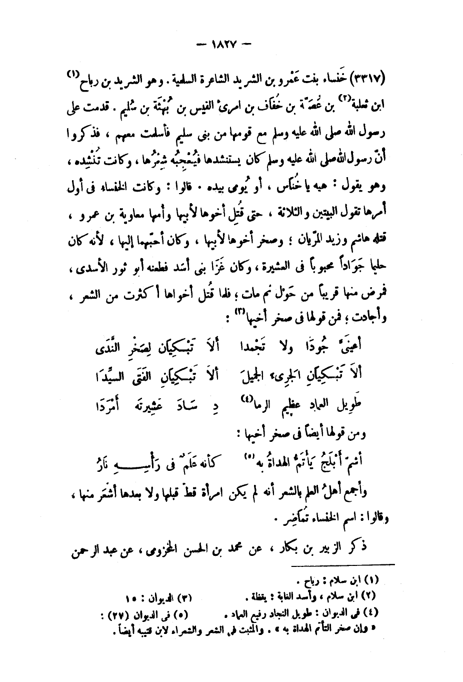 (٣٣١٧) خنساء بنت عَمْرو بْن الشريد الشاعرة السلمية.