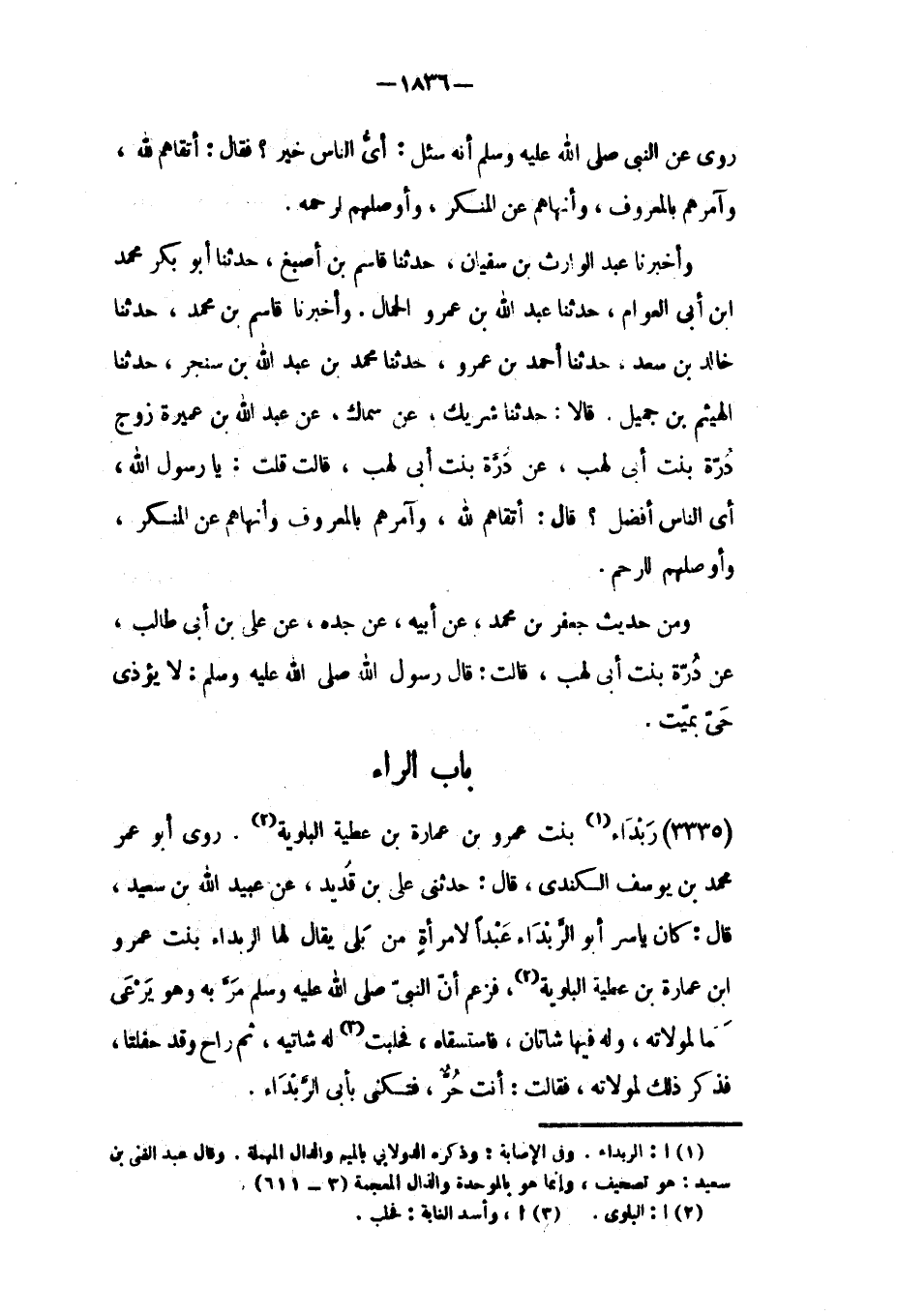 روى عن النبي صلى الله عليه وسلم أنه سئل: أي الناس خير؟ فَقَالَ: أتقاهم للَّه، وآمرهم بالمعروف، وأنها هم عَنِ المنكر، وأوصلهم لرحمه. وَأَخْبَرَنَا عَبْدُ الْوَارِثِ بن سفيان، حدثنا قاسم بن أصبغ، حدثنا أبو بكر محمد ابن أَبِي الْعَوَّامِ، حَدَّثَنَا عَبْدُ اللَّهِ بْنُ عَمْرٍو الْحَمَّالُ. وَأَخْبَرَنَا قَاسِمُ بْنُ مُحَمَّدٍ، حَدَّثَنَا خَالِدُ بْنُ سَعْدٍ، حَدَّثَنَا أَحْمَدُ بْنُ عَمْرٍو، حَدَّثَنَا مُحَمَّدُ بْنُ عَبْدِ اللَّهِ بْنِ سَنْجَرَ، حَدَّثَنَا الْهَيْثَمُ بْنُ جَمِيلٍ. قَالا: حَدَّثَنَا شَرِيكٌ، عَنْ سِمَاكٍ، عَنْ عَبْدِ اللَّهِ بْنِ عُمَيْرَةَ زَوْجِ دُرَّةَ بِنْتِ أَبِي لَهَبٍ، عَنْ دُرَّةَ بِنْتِ أَبِي لَهَبٍ، قَالَتْ قُلْتُ: يَا رَسُولَ اللَّهِ، أَيُّ النَّاسِ أَفْضَلُ؟ قَالَ: أَتْقَاهُمْ للَّه، وَآمَرُهُمْ بِالْمَعْرُوفِ وَأَنْهَاهُمْ عَنِ الْمُنْكَرِ، وَأَوْصَلُهُمْ لِلرَّحِمِ. وَمِنْ حَدِيثِ جَعْفَرِ بْنِ مُحَمَّدٍ، عَنْ أَبِيهِ، عَنْ جَدِّهِ، عَنْ عَلِيِّ بْنِ أَبِي طَالِبٍ، عَنْ دُرَّةَ بِنْتِ أَبِي لَهَبٍ، قَالَتْ: قَالَ رَسُولُ اللَّهِ صَلَّى اللَّهُ عَلَيْهِ وَسَلَّمَ: لا يُؤْذَى حَيٌّ بِمَيِّتٍ.