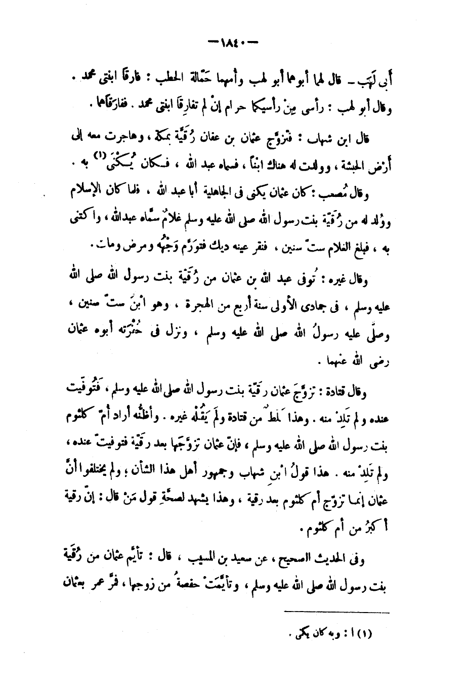 قَالَ ابْن شهاب: فتزوج عُثْمَان بْن عفان رقية بمكة، وهاجرت معه إِلَى أرض الحبشة، وولدت له هناك ابنا، فسماه عَبْد اللَّهِ، فكان يكنى [١] به.