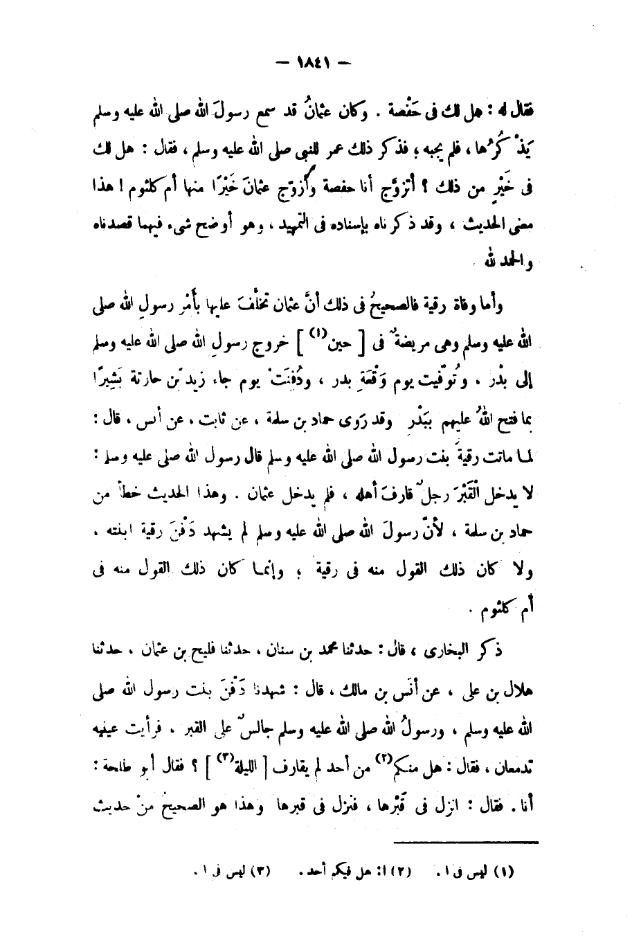 لا يَدْخُلُ الْقَبْرَ رَجُلٌ قَارَفَ أَهْلَهُ، فَلَمْ يَدْخُلْ عُثْمَانُ. وَهَذَا الْحَدِيثُ خَطَأٌ مِنْ حَمَّادِ بْنِ سَلَمَةَ، لأن رسول الله صلى الله عليه وسلم لَمْ يَشْهَدْ دَفْنَ رُقَيَّةَ ابْنَتَهُ، وَلا كَانَ ذَلِكَ الْقَوْلُ مِنْهُ فِي رُقَيَّةَ، وَإِنَّمَا كَانَ ذَلِكَ الْقَوْلُ مِنْهُ فِي أُمِّ كُلْثُومٍ. ذَكَرَ الْبُخَارِيُّ، قَالَ: حَدَّثَنَا مُحَمَّدُ بْنُ سِنَانٍ، حَدَّثَنَا فُلَيْحُ بْنُ عُثْمَانَ، حَدَّثَنَا هِلالُ بْنُ عَلِيٍّ، عَنْ أَنَسِ بْنِ مَالِكٍ، قَالَ: شَهِدْنَا دَفْنَ بنت رسول الله صلى الله عليه وسلم، ورسول الله صلى الله عليه وسلم جالس عَلَى الْقَبْرِ، فَرَأَيْتُ عَيْنَيْهِ تَدْمَعَانِ، فَقَالَ: هَلْ مِنْكُمْ [٢] مِنْ أَحَدٍ لَمْ يُقَارِفِ [اللَّيْلَةَ [٣]] ؟ فَقَالَ أَبُو طَلْحَةَ: