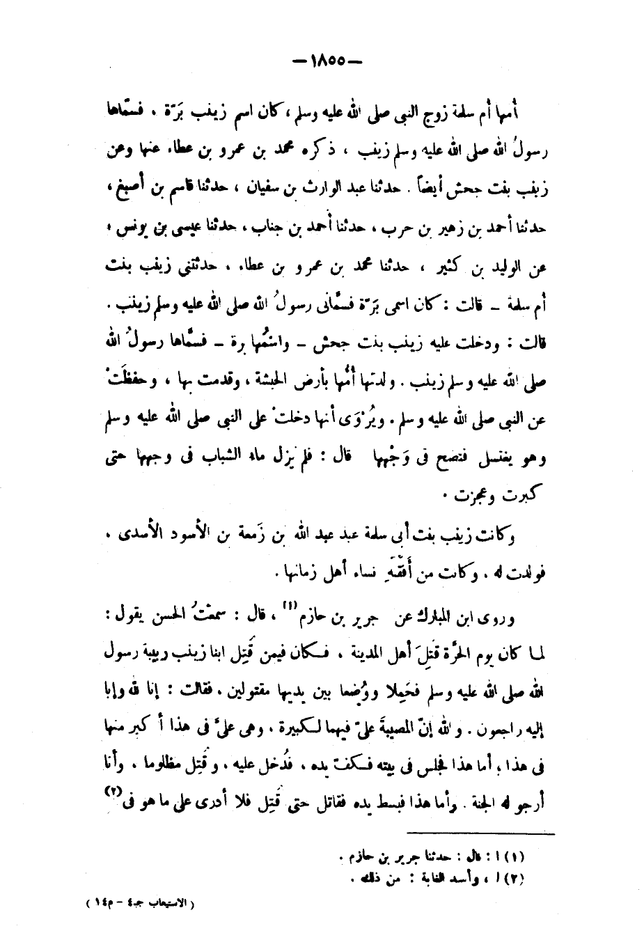 قَالَتْ: وَدَخَلَتْ عَلَيْهِ زَيْنَبُ بِنْتُ جَحْشٍ- وَاسْمُهَا بَرَّةُ- فَسَمَّاهَا رَسُولُ اللَّهِ صَلَّى اللَّهُ عَلَيْهِ وَسَلَّمَ زَيْنَبَ. وَلَدَتْهَا أُمُّهَا بِأَرْضِ الْحَبَشَةِ، وَقَدِمَتْ بِهَا، وَحَفِظَتْ عَنِ النَّبِيِّ صَلَّى اللَّهُ عَلَيْهِ وَسَلَّمَ. ويروى أنها دخلت عَلَى النَّبِيّ صَلَّى اللَّهُ عَلَيْهِ وَسَلَّمَ وَهُوَ يغتسل فتصح فِي وجهها قَالَ: فلم يزل ماء الشباب فِي وجهها حَتَّى كبرت وعجزت. وكانت زينب بنت أبى سلمة عبد عَبْد اللَّهِ بْن زمعة بْن الأسود الأسدي، فولدت له، وكانت من أفقه نساء أهل زمانها.