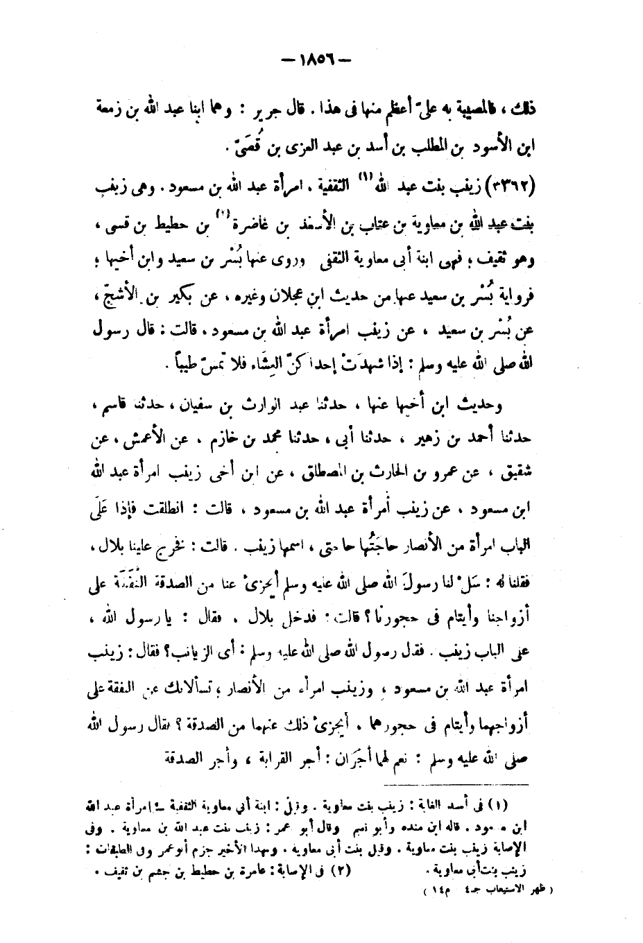 [١] في أسد الغابة: زينب بنت معاوية. وقيل: ابنة أبى معاوية الثقفية- امرأة عبد الله ابن مسعود. قاله ابن مندة وأبو نعيم وقال أبو عمر: زينب بنت عبد الله بن معاوية. وفي الإصابة زينب بنت معاوية. وقيل بنت أبى معاوية. وبهذا الأخير جزم أبو عمر وفي الطبقات:
