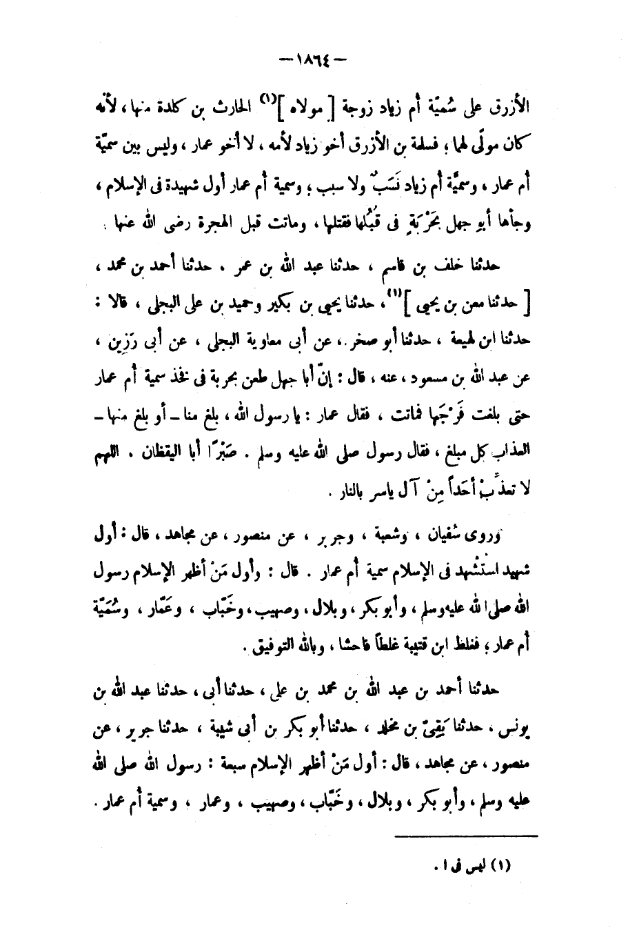 حَدَّثَنَا ابْنُ لَهِيعَةَ، حَدَّثَنَا أَبُو صَخْرٍ، عَنْ أَبِي مُعَاوِيَةَ الْبَجَلِيُّ، عَنْ أَبِي رَزِينٍ، عَنْ عَبْدِ اللَّهِ بْنِ مَسْعُودٍ، عَنْهُ، قَالَ: إِنَّ أَبَا جَهْلٍ طَعَنَ بِحَرْبَةٍ فِي فَخِذِ سُمَيَّةَ أُمِّ عَمَّارٍ حَتَّى بَلَغَتْ فَرْجَهَا فَمَاتَتْ، فَقَالَ عَمَّارٌ: يَا رَسُولَ اللَّهِ، بَلَغَ مِنَّا- أَوْ بَلَغَ مِنْهَا- الْعَذَابُ كُلَّ مَبْلَغٍ، فَقَالَ رَسُولُ اللَّهِ صَلَّى اللَّهُ عَلَيْهِ وَسَلَّمَ. صَبْرًا أَبَا الْيَقْظَانِ. اللَّهمّ لا تُعَذِّبْ أَحَدًا مِنْ آلِ يَاسِرٍ بِالنَّارِ. وَرَوَى سُفْيَانُ، وَشُعْبَةُ، وَجَرِيرٌ، عَنْ مَنْصُورٍ، عَنْ مُجَاهِدٍ، قَالَ: أَوَّلُ شَهِيدٍ اسْتُشْهِدَ فِي الإِسْلامِ سُمَيَّةُ أعمار. عَمَّارٍ. قَالَ: وَأَوَّلُ مَنْ أَظْهَرَ الإِسْلامَ رَسُولُ الله صلى الله عليه وسلم، وأبو بكر، وَبِلالٌ، وَصُهَيْبٌ، وَخَبَّابٌ، وَعَمَّارٌ، وَسُمَيَّةُ أُمُّ عَمَّارٍ، فَغَلَطَ ابْنُ قُتَيْبَةَ غَلَطًا فَاحِشًا، وباللَّه التَّوْفِيقُ.