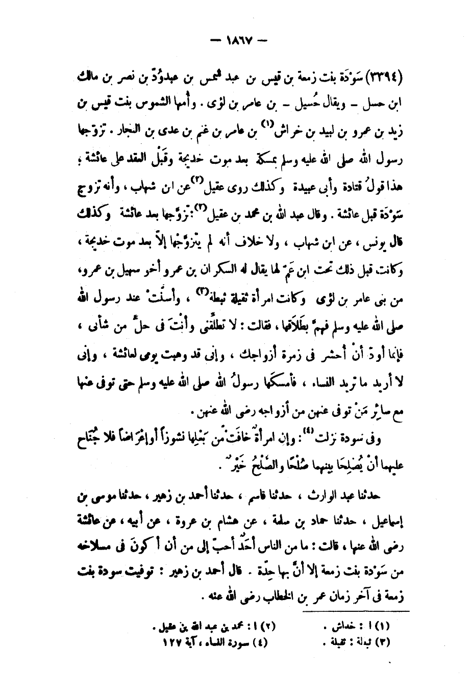 (٣٣٩٤) سودة بنت زمعة بْن قيس بْن عبد شمس بن عبد ود بن نصر بن مالك ابن حسل