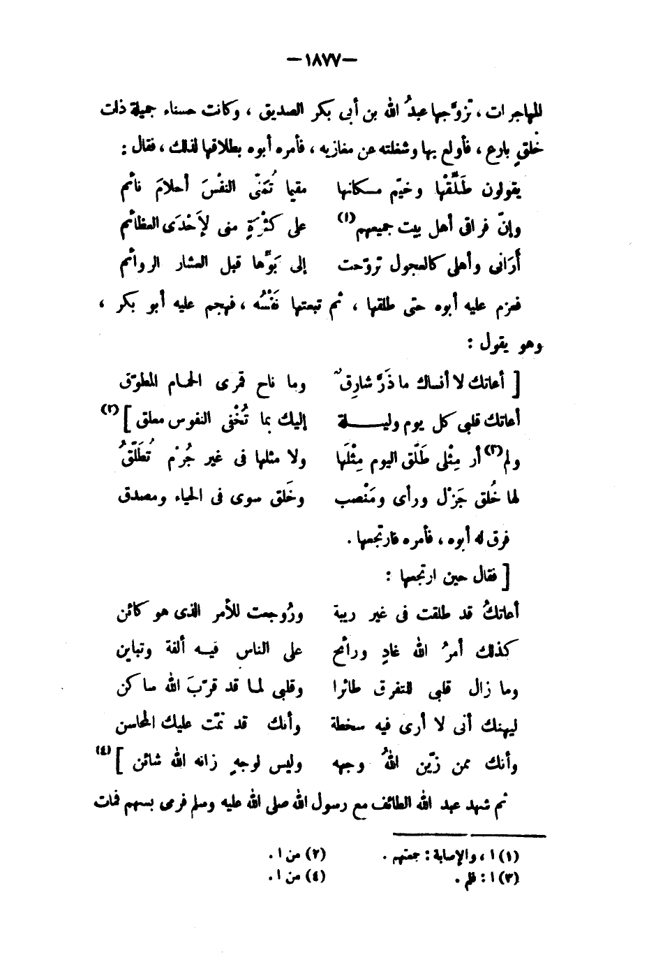 فعزم عَلَيْهِ أبوه حَتَّى طلقها، ثم تبعتها نفسه، فهجم عَلَيْهِ أَبُو بَكْر، وَهُوَ يقول: