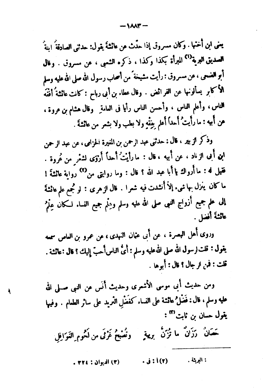 قُلْتُ: فَمِنَ الرِّجَالِ؟ قَالَ: أَبُوهَا. ومن حديث أبي مُوسَى الأشعري وحديث أنس عَنِ النَّبِيّ صَلَّى اللَّهُ عَلَيْهِ وَسَلَّمَ، قَالَ: فضل عائشة عَلَى النساء كفضل الثريد عَلَى سائر الطعام. وفيها يقول حسان بن ثابت [٣] :