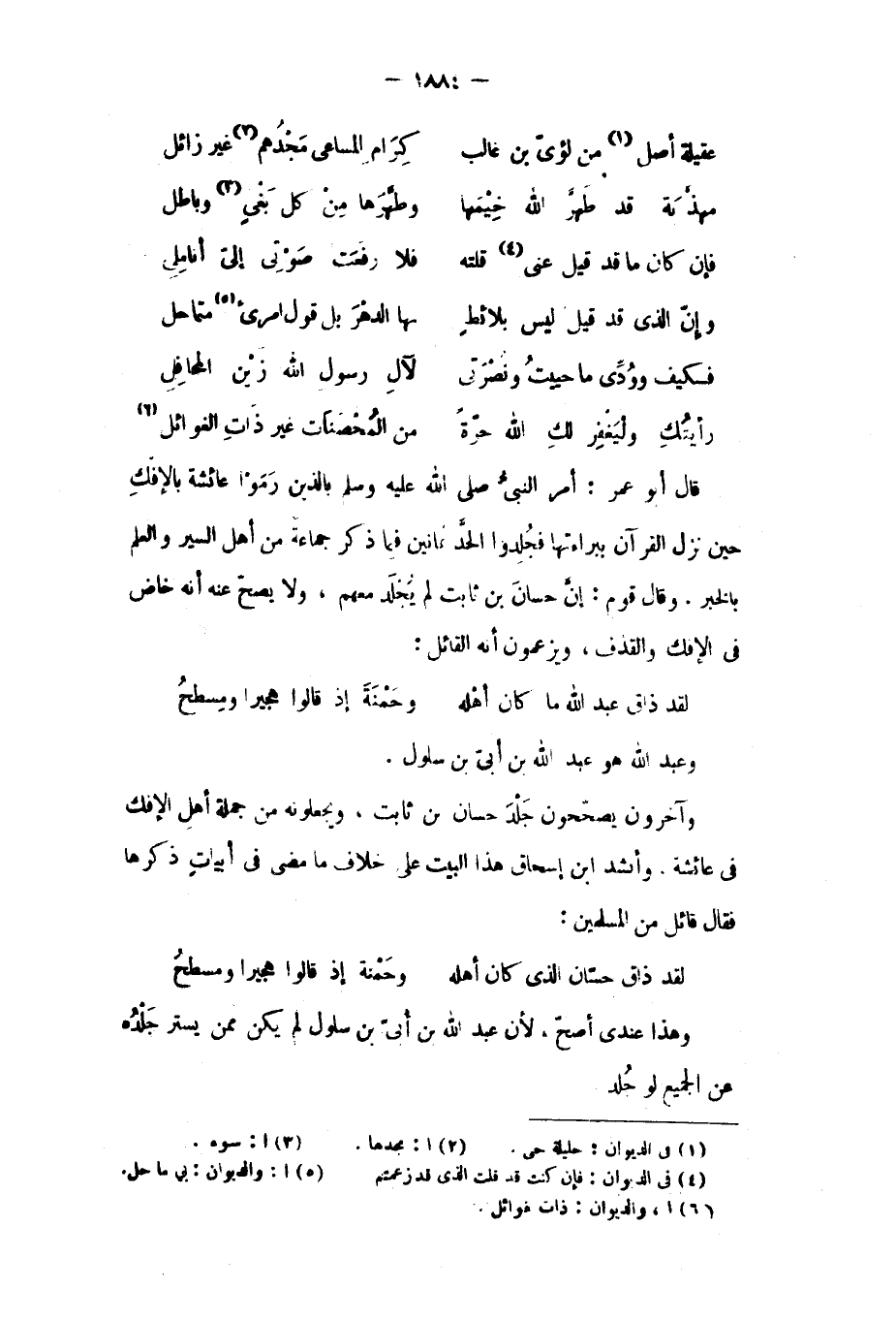 وآخرون يصححون جلد حسان بْن ثابت، ويجعلونه من جملة أهل الإفك فِي عائشة. وأنشد ابْن إِسْحَاق هَذَا البيت عَلَى خلاف مَا مضى فِي أبيات ذكرها فَقَالَ قائل من المسلمين: