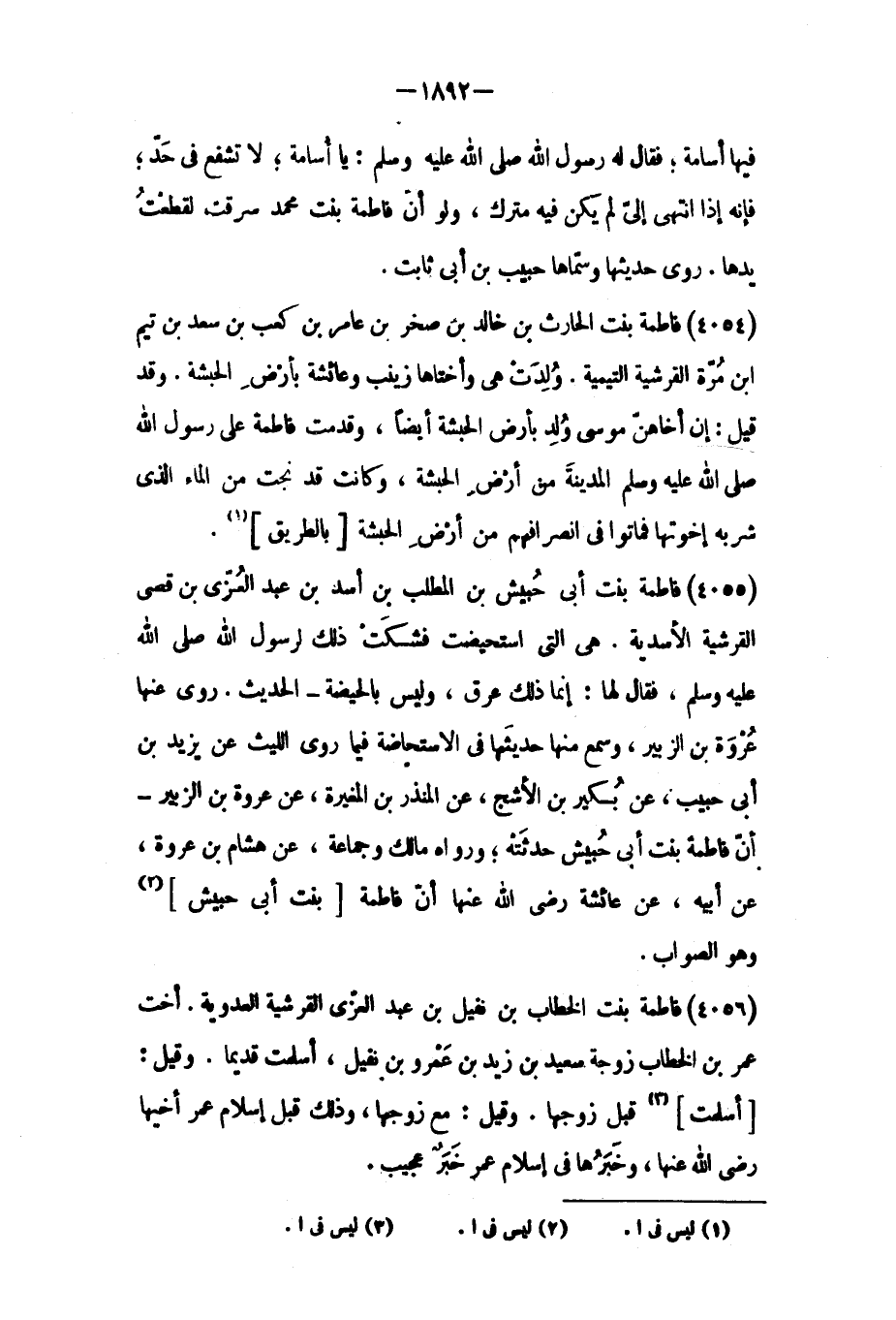 (٤٠٥٥) فاطمة بنت أبي حبيش بن المطلب بن أسد بن عبد العزى بْن قصي القرشية الأسدية.