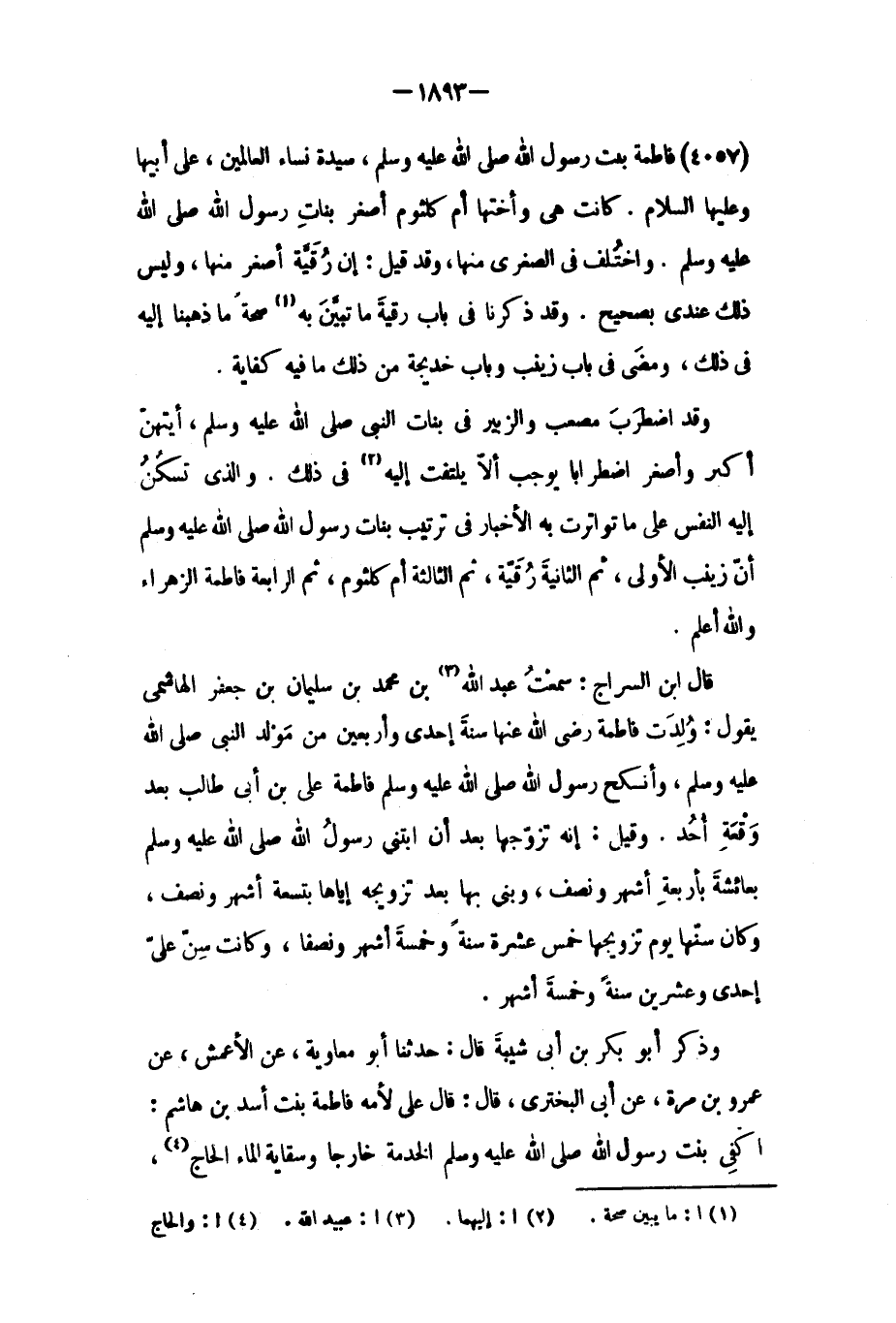 وقد اضطرب مصعب والزبير فِي بنات النَّبِيّ صَلَّى اللَّهُ عَلَيْهِ وَسَلَّمَ، أيتهن أكبر وأصغر اضطرابًا يوجب ألا يلتفت إليه [٢] فِي ذلك. والذي تسكن إليه النفس عَلَى مَا تواترت به الأخبار فِي ترتيب بنات رَسُول اللَّهِ صَلَّى اللَّهُ عَلَيْهِ وَسَلَّمَ أن زينب الأولى، ثم الثانية رقية، ثم الثالثة أم كلثوم، ثم الرابعة فاطمة الزهراء والله أعلم.