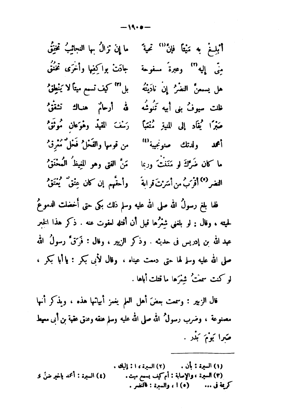 قَالَ الزُّبَيْر: وسمعت بعض أهل العلم يغمز أبياتها هذه، ويذكر أنها مصنوعة، وضرب رَسُول اللَّهِ صَلَّى اللَّهُ عَلَيْهِ وَسَلَّمَ عنقه وعنق عقبة بْن أبي معيط صبرًا يوم بدر.