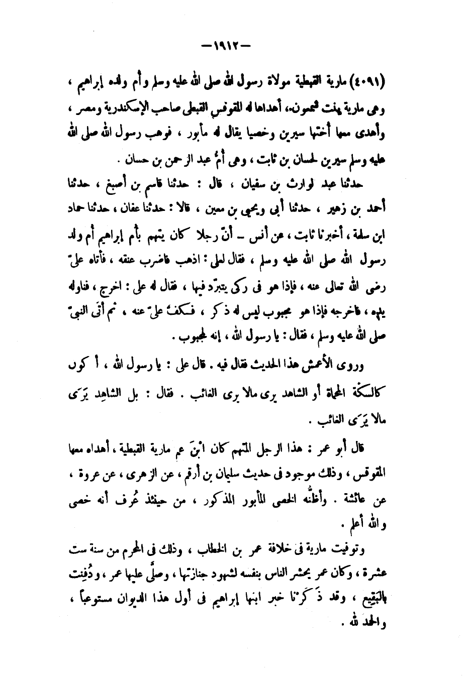 حَدَّثَنَا عبد لوارث بن سفيان، قال: حدثنا قاسم بن أصبغ، حَدَّثَنَا أَحْمَدُ بْنُ زُهَيْرٍ، حَدَّثَنَا أَبِي وَيَحْيَى بْنُ مَعِينٍ، قَالا: حَدَّثَنَا عَفَّانُ، حَدَّثَنَا حَمَّادُ ابن سَلَمَةَ، أَخْبَرَنَا ثَابِتٌ، عَنْ أَنَسٍ- أَنَّ رَجُلا كَانَ يُتَّهَمُ بِأُمِّ إِبْرَاهِيمَ أُمِّ وَلَدِ رَسُولِ اللَّهِ صَلَّى اللَّهُ عَلَيْهِ وَسَلَّمَ، فَقَالَ لِعَلِيٍّ: اذْهِبْ فَاضْرِبْ عُنُقَهُ، فَأَتَاهُ عَلِيٌّ رَضِيَ اللَّهُ تعالى عَنْهُ، فَإِذَا هُوَ فِي رَكِيٍّ يَتَبَرَّدُ فِيهَا، فَقَالَ لَهُ عَلِيٌّ: اخْرُجْ، فَنَاوَلَهُ يَدَهُ، فَأَخْرَجَهُ فَإِذَا هُوَ مَجْبُوبٌ لَيْسَ لَهُ ذَكَرٌ، فَكَفَّ عَلِيٌّ عَنْهُ، ثُمَّ أَتَى النَّبِيُّ صَلَّى اللَّهُ عَلَيْهِ وَسَلَّمَ، فَقَالَ: يَا رَسُولَ اللَّهِ، إِنَّهُ لَمَجْبُوبٌ. وَرَوَى الأَعْمَشُ هَذَا الْحَدِيثَ فَقَالَ فِيهِ. قَالَ عَلِيٌّ: يَا رَسُولَ اللَّهِ، أَكُونُ كَالسِّكَّةِ الْمُحْمَاةِ أَوِ الشَّاهِدِ يَرَى مَا لا يَرَى الْغَائِبُ. فَقَالَ: بَلِ الشَّاهِدِ يَرَى مَا لا يَرَى الْغَائِبُ. قَالَ أَبُو عُمَرَ: هَذَا الرَّجُلُ الْمُتَّهَمُ كَانَ ابْنَ عَمِّ مَارِيَّةَ الْقِبْطِيَّةِ، أَهْدَاهُ مَعَهَا الْمُقَوْقِسُ، وَذَلِكَ مَوْجُودٌ فِي حَدِيثِ سُلَيْمَانَ بْنِ أَرْقَمَ، عَنِ الزُّهْرِيِّ، عَنْ عُرْوَةَ، عَنْ عَائِشَةَ. وَأَظُنُّهُ الْخَصِيَّ الْمَأْبُورَ الْمَذْكُورَ، مِنْ حِينَئِذٍ عُرِفَ أَنَّهُ خَصِيٌّ وَاللَّهُ أَعْلَمُ.