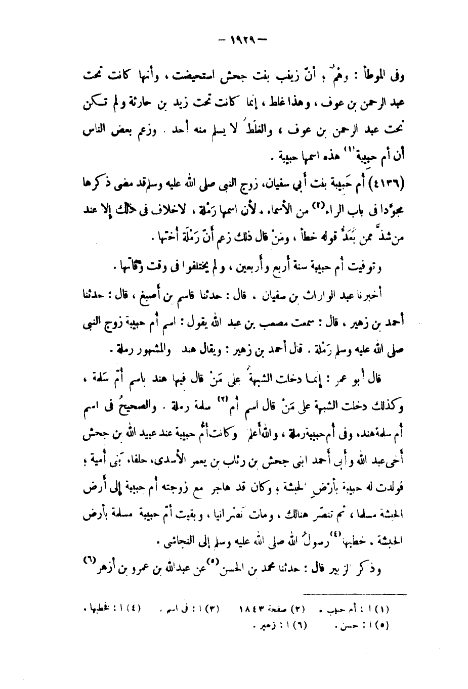 وفي الموطأ: وهم، أن زينب بنت جحش استحيضت، وأنها كانت تحت عَبْد الرَّحْمَنِ بْن عوف، وهذا غلط، إنما كانت تحت زيد بْن حارثة ولم تكن تحت عَبْد الرَّحْمَنِ بْن عوف، والغلط لا يسلم منه أحد. وزعم بعض الناس أن أم حبيبة [١] هذه اسمها حبيبة.