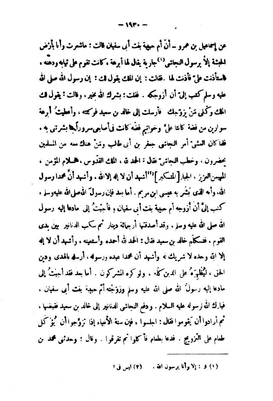 فَلَمَّا كَانَ الْعَشِيُّ أَمَرَ النَّجَاشِيُّ جَعْفَرَ بْنَ أَبِي طَالِبٍ وَمَنْ هُنَاكَ مَعَهُ مِنَ الْمُسْلِمِينَ يَحْضُرُونَ، وَخَطَبَ النَّجَاشِيُّ فَقَالَ: الْحَمْدُ للَّه، الْمَلِكُ الْقُدُّوسُ، السَّلامُ الْمُؤْمِنُ، الْمُهَيْمِنُ الْعَزِيزُ، الْجَبَّارُ [الْمُتَكَبِّرُ] [٢] أَشْهَدُ أَنَّ لا إِلَهَ إِلا اللَّهُ، وَأَشْهَدُ أَنَّ مُحَمَّدًا رَسُولُ اللَّهِ، وَأَنَّهُ الّذي بشر به عيسى بن مَرْيَمَ. أَمَّا بَعْدُ فَإِنَّ رَسُولَ اللَّهِ صَلَّى اللَّهُ عَلَيْهِ وَسَلَّمَ، كَتَبَ إِلَيَّ أَنْ أُزَوِّجَهُ أُمَّ حَبِيبَةَ بِنْتَ أَبِي سُفْيَانَ، فَأَجَبْتُ إِلَى مَا دَعَا إِلَيْهِ رَسُولُ اللَّهِ صَلَّى اللَّهُ عَلَيْهِ وَسَلَّمَ. وَقَدْ أَصْدَقْتُهَا أَرْبَعَمِائَةِ دِينَارٍ ثُمَّ سَكَبَ الدَّنَانِيرَ بَيْنَ يَدَيِ الْقَوْمِ، فَتَكَلَّمَ خَالِدُ بْنُ سَعِيدٍ فَقَالَ: الْحَمْدُ للَّه أَحْمَدُهُ وَأَسْتَعِينُهُ، وَأَشْهَدُ أَنَّ لا إِلَهَ إِلا اللَّهُ وَحْدَهُ لا شَرِيكَ لَهُ وَأَشْهَدُ أَنَّ مُحَمَّدًا عَبْدَهُ وَرَسُولُهُ، أَرْسَلَهُ بِالْهُدَى وَدِينِ الْحَقَّ، لِيُظْهِرَهُ عَلَى الدِّينِ كُلِّهِ، وَلَوْ كَرِهَ الْمُشْرِكُونَ. أَمَّا بَعْدُ فَقَدْ أَجَبْتُ إِلَى مَا دَعَا إِلَيْهِ رَسُولُ اللَّهِ صَلَّى اللَّهُ عَلَيْهِ وَسَلَّمَ وَزَوَّجْتُهُ أُمَّ حبيبة بنت أبى سفيان.