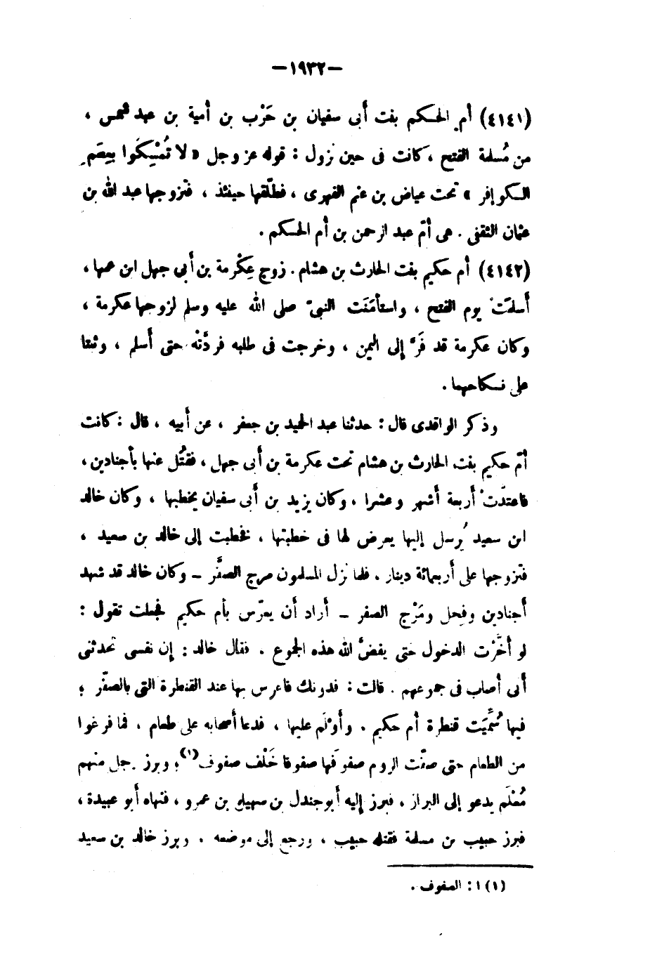 وَذَكَرَ الْوَاقِدِيُّ قَالَ: حَدَّثَنَا عَبْدُ الْحَمِيدِ بْنُ جَعْفَرٍ، عَنْ أَبِيهِ، قَالَ: كَانَتْ أُمُّ حَكِيمِ بِنْتُ الْحَارِثِ بْنِ هِشَامٍ تَحْتَ عِكْرِمَةَ بْنِ أَبِي جَهْلٍ، فَقُتِلَ عَنْهَا بِأَجْنَادِينَ، فَاعْتَدَّتْ أَرْبَعَةَ أَشْهُرٍ وَعَشْرًا، وَكَانَ يَزِيدُ بْنُ أبى سفيان يخطبها، وكان خالد ابن سَعِيدٍ يُرْسِلُ إِلَيْهَا يَعْرِضُ لَهَا فِي خِطْبَتِهَا، فَخُطِبَتْ إِلَى خَالِدِ بْنِ سَعِيدٍ، فَتَزَوَّجَهَا عَلَى أَرْبَعِمِائَةِ دِينَارٍ، فَلَمَّا نَزَلَ الْمُسْلِمُونَ مَرْجَ الصُّفَّرِ- وكان خالد قد شهد أجنادين وفحل وَمَرْجَ الصُّفَّرِ- أَرَادَ أَنْ يُعْرِّسَ بِأُمِّ حَكِيمٍ فَجَعَلَتْ تَقُولُ: