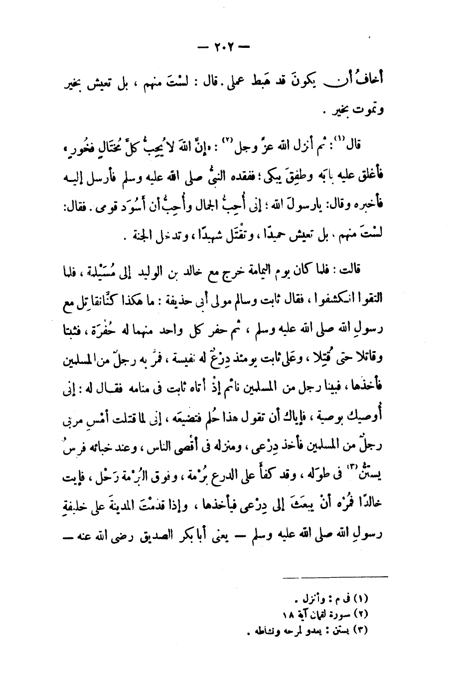 قَالَ [١] : ثُمَّ أَنْزَلَ اللَّهُ عَزَّ وَجَلَّ [٢] : «إِنَّ اللَّهَ لا يُحِبُّ كُلَّ مُخْتالٍ فَخُورٍ ٣١: ١٨ فَأَغْلَقَ عَلَيْهِ بَابَهُ وَطَفِقَ يَبْكِي، فَفَقَدَهُ النَّبِيُّ صلى الله عليه وَسَلَّمَ فَأَرْسَلَ إِلَيْهِ فَأَخْبَرَهُ وَقَالَ: يَا رَسُولَ اللَّهِ، إِنِّي أُحِبُّ الْجَمَالَ وَأُحِبُّ أَنْ أَسُودَ قَوْمِي. فَقَالَ: