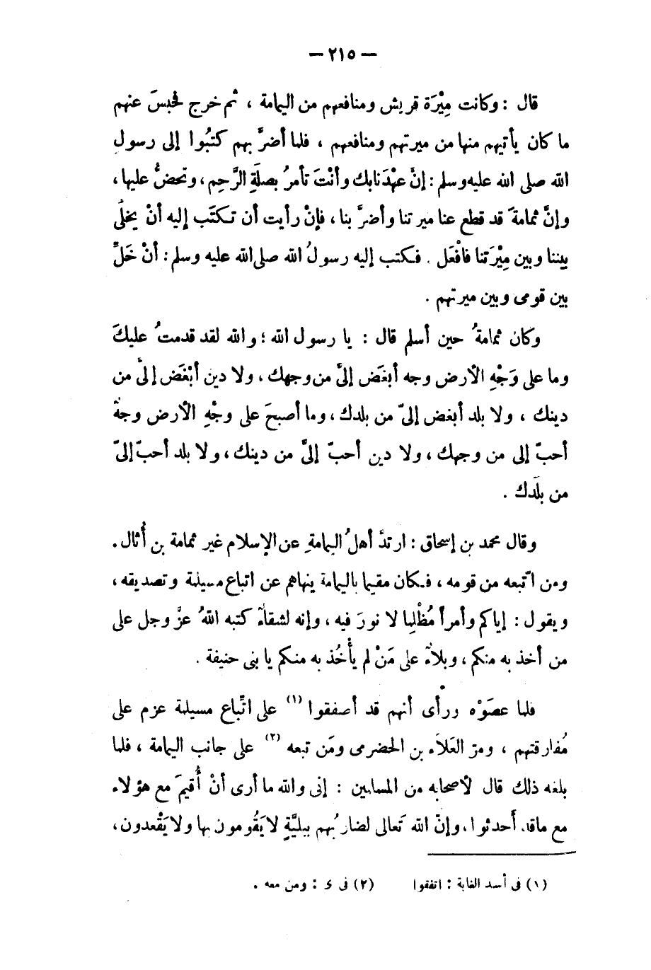 وَقَالَ مُحَمَّدُ بْنُ إِسْحَاقَ: ارْتَدَّ أَهْلُ الْيَمَامَةِ عَنِ الإِسْلامِ غَيْرَ ثُمَامَةَ بْنِ أُثَالٍ.