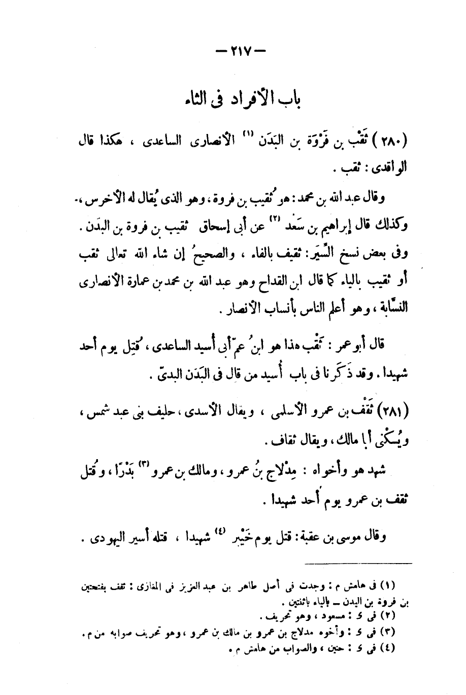 وفي بعض نسخ السير: ثقيف بالفاء، والصحيح إن شاء الله تعالى ثقب أو ثقيب بالياء كما قَالَ ابن القداح وهو عَبْد الله بن مُحَمَّد بن عمارة الأنصاري النسابة، وهو أعلم الناس بأنساب الأنصار.