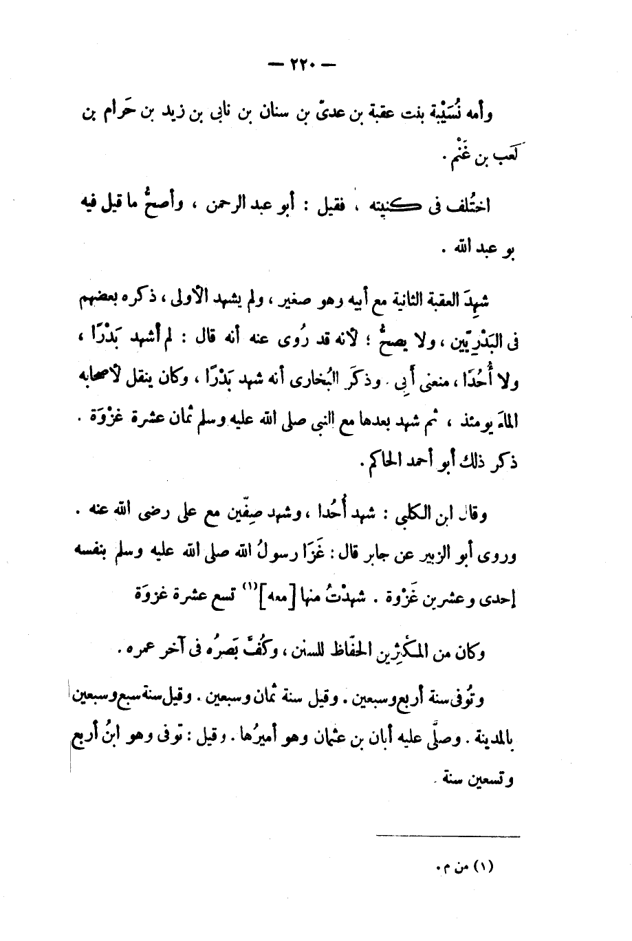 وروى أبو الزبير عن جابر قَالَ: غزا رَسُول اللَّهِ صَلَّى اللَّهُ عَلَيْهِ وَسَلَّمَ بنفسه إحدى وعشرين غزوة. شهدت منها [معه] [١] تسع عشرة غزوة وكان من المكثرين الحفاظ للسنن، وكف بصره في آخر عمره.