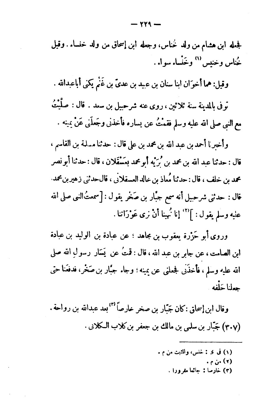 قَالَ: حَدَّثَنِي شُرَحْبِيلُ أَنَّهُ سَمِعَ جَبَّارَ بْنَ صَخْرٍ يَقُولُ: [سَمِعْتُ النَّبِيَّ صَلَّى اللَّهُ عليه وَسَلَّمَ يَقُولُ:] [٢] إِنَّا نُهِينَا أَنْ نَرَى عَوْرَاتِنَا. وَرَوَى أَبُو حَزْرَةَ يَعْقُوبُ بْنُ مُجَاهِدٍ، عَنْ عبادة بن الوليد بن عبادة ابن الصَّامِتِ، عَنْ جَابِرِ بْنِ عَبْدِ اللَّهِ، قَالَ: قُمْتُ عَنْ يَسَارِ رَسُولِ اللَّهِ صَلَّى اللَّهُ عليه وسلم، فأخذني فجعلني عن يمينه، وجاء جبّار بن صخر، فدفعنا حتى جعلنا حلفه.