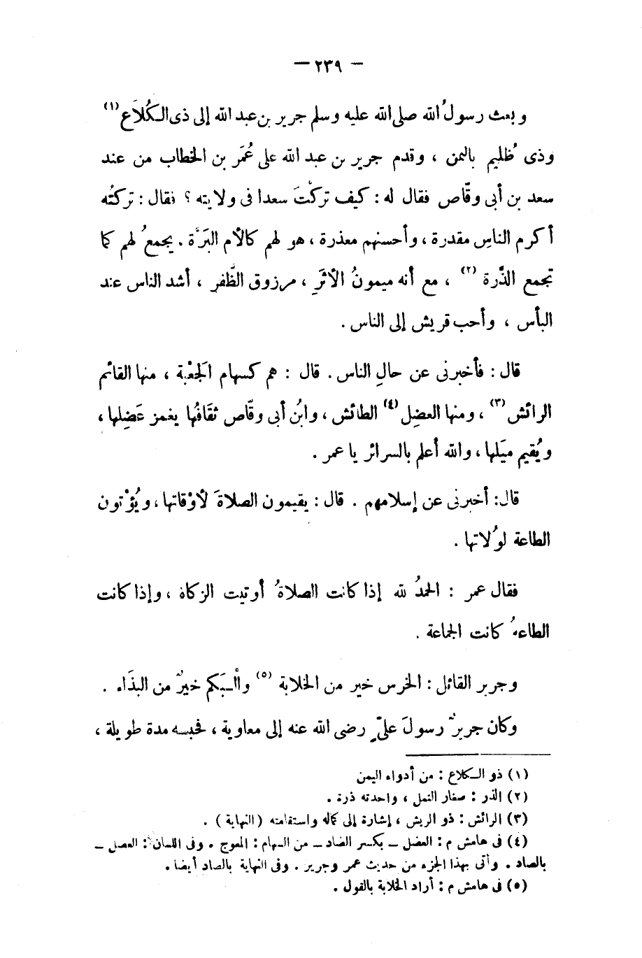 وبعث رَسُول اللَّهِ صَلَّى اللَّهُ عَلَيْهِ وَسَلَّمَ جَرِيرَ بْنَ عَبْدِ اللَّهِ إِلَى ذِي الْكُلاعِ [١] وَذِي ظُلَيْمٍ بِالْيَمَنِ، وَقَدِمَ جَرِيرُ بْنُ عَبْدِ اللَّهِ عَلَى عُمَرَ بْنِ الْخَطَّابِ مِنْ عِنْدِ سَعْدِ بْنِ أَبِي وَقَّاصٍ فَقَالَ لَهُ: كَيْفَ تَرَكْتَ سَعْدًا فِي وِلايَتِهِ؟ فَقَالَ: تَرَكْتُهُ أَكْرَمَ الناس مقدرة، وأحسنهم معذرة، هو لهم كَالأُمِّ الْبَرَّةِ، يَجْمَعُ لَهُمْ كَمَا تُجْمَعُ الذَّرَّةُ [٢] ، مَعَ أَنَّهُ مَيْمُونُ الأَثَرِ، مَرْزُوقُ الظَّفْرِ، أَشَدُّ النَّاسِ عِنْدَ الْبَأْسِ، وَأَحَبُّ قُرَيْشٍ إِلَى النَّاسِ.