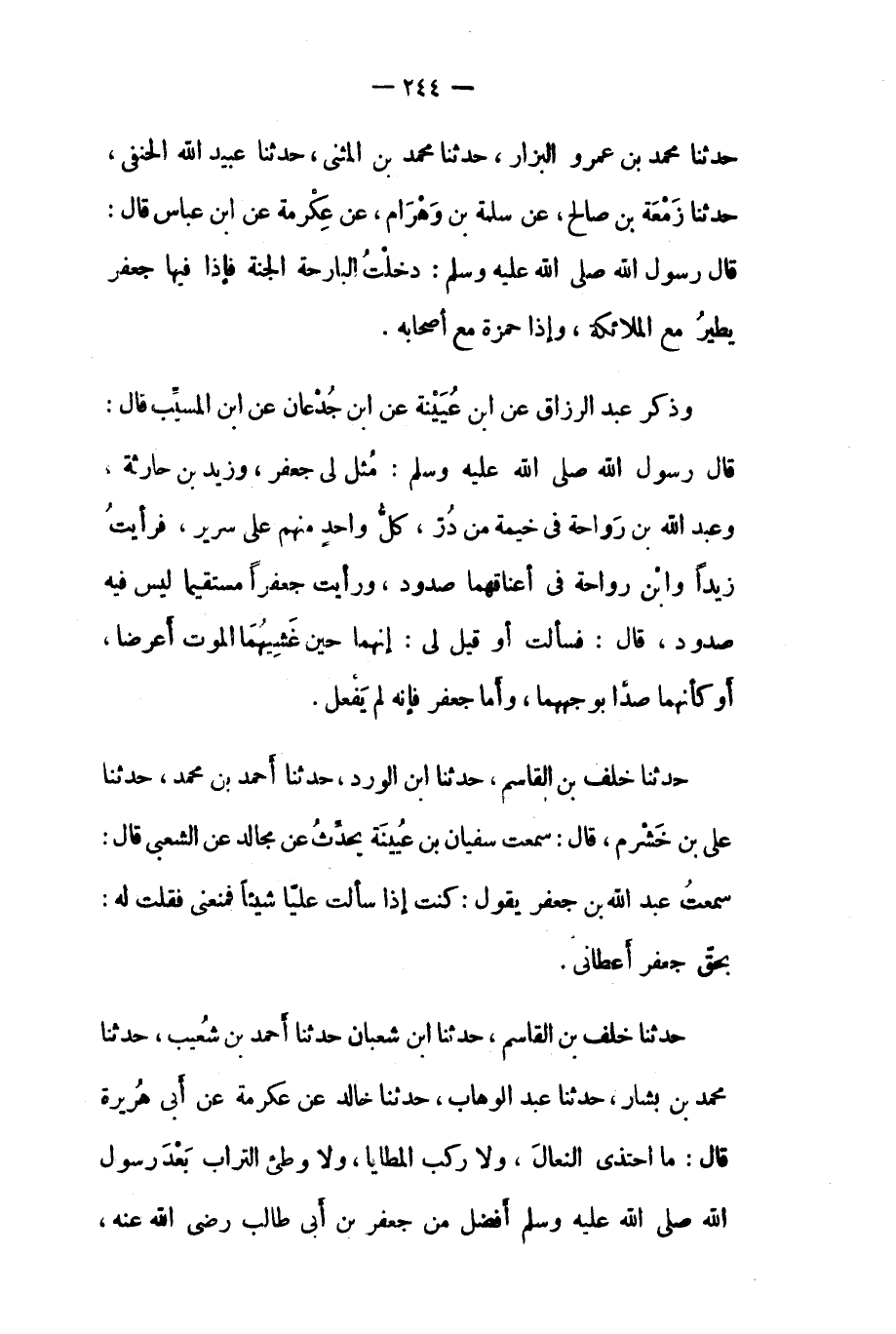 قَالَ رَسُولُ اللَّهِ صَلَّى اللَّهُ عليه وَسَلَّمَ: مُثِّلَ لِي جَعْفَرٌ، وَزَيْدُ بْنُ حَارِثَةَ، وَعَبْدُ اللَّهِ بْنُ رَوَاحَةَ فِي خَيْمَةٍ مِنْ دُرٍّ، كُلُّ وَاحِدٍ مِنْهُمْ عَلَى سَرِيرٍ، فَرَأَيْتُ زَيْدًا وَابْنَ رَوَاحَةَ فِي أَعْنَاقِهِمَا صُدُودٌ، وَرَأَيْتُ جَعْفَرًا مُسْتَقِيمًا لَيْسَ فِيهِ صُدُودٌ، قَالَ: فَسَأَلْتُ أَوْ قِيلَ لِي: إِنَّهُمَا حِينَ غَشَيِهُمَا الْمَوْتُ أَعْرَضَا، أَوْ كَأَنَّهُمَا صَدَّا بِوَجْهِهِمَا، وَأَمَّا جَعْفَرُ فَإِنَّهُ لَمْ يَفْعَلْ. حَدَّثَنَا خَلَفُ بْنُ الْقَاسِمِ، حَدَّثَنَا ابْنُ الْوَرْدِ، حَدَّثَنَا أَحْمَدُ بْنُ مُحَمَّدٍ، حَدَّثَنَا عَلِيُّ بْنُ خَشْرَمٍ، قَالَ: سَمِعْتُ سُفْيَانَ بْنَ عُيَيْنَةَ يُحَدِّثُ عَنْ مُجِالِدٍ عَنِ الشَّعْبِيِّ قَالَ: