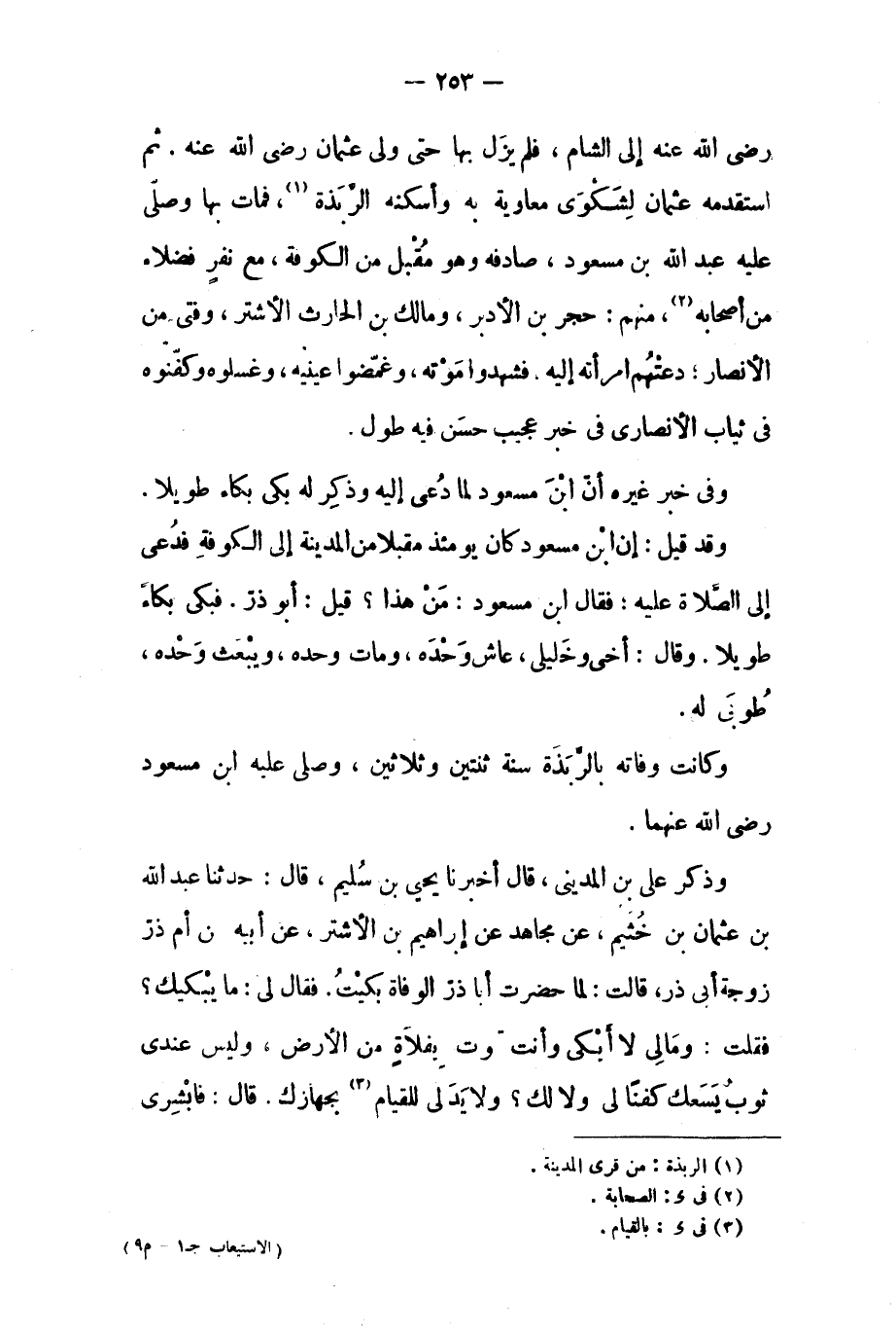 رضي الله عنه إلى الشام، فلم يزل بها حتى ولي عثمان رضي الله عنه. ثم استقدمه عثمان لشكوى معاوية به وأسكنه الربذة [١] ، فمات بها وصلى عليه عَبْد الله بن مسعود، صادفه وهو مقبل من الكوفة، مع نفر فضلاء من أصحابه [٢] ، منهم: حجر بن الأدبر، ومالك بن الحارث الأشتر، وفتى من الأنصار، دعتهم امرأته إليه فشهدوا موته، وغمضوا عينيه، وغسلوه وكفّنوه في ثياب الأنصاري في خبر عجيب حسن فيه طول.