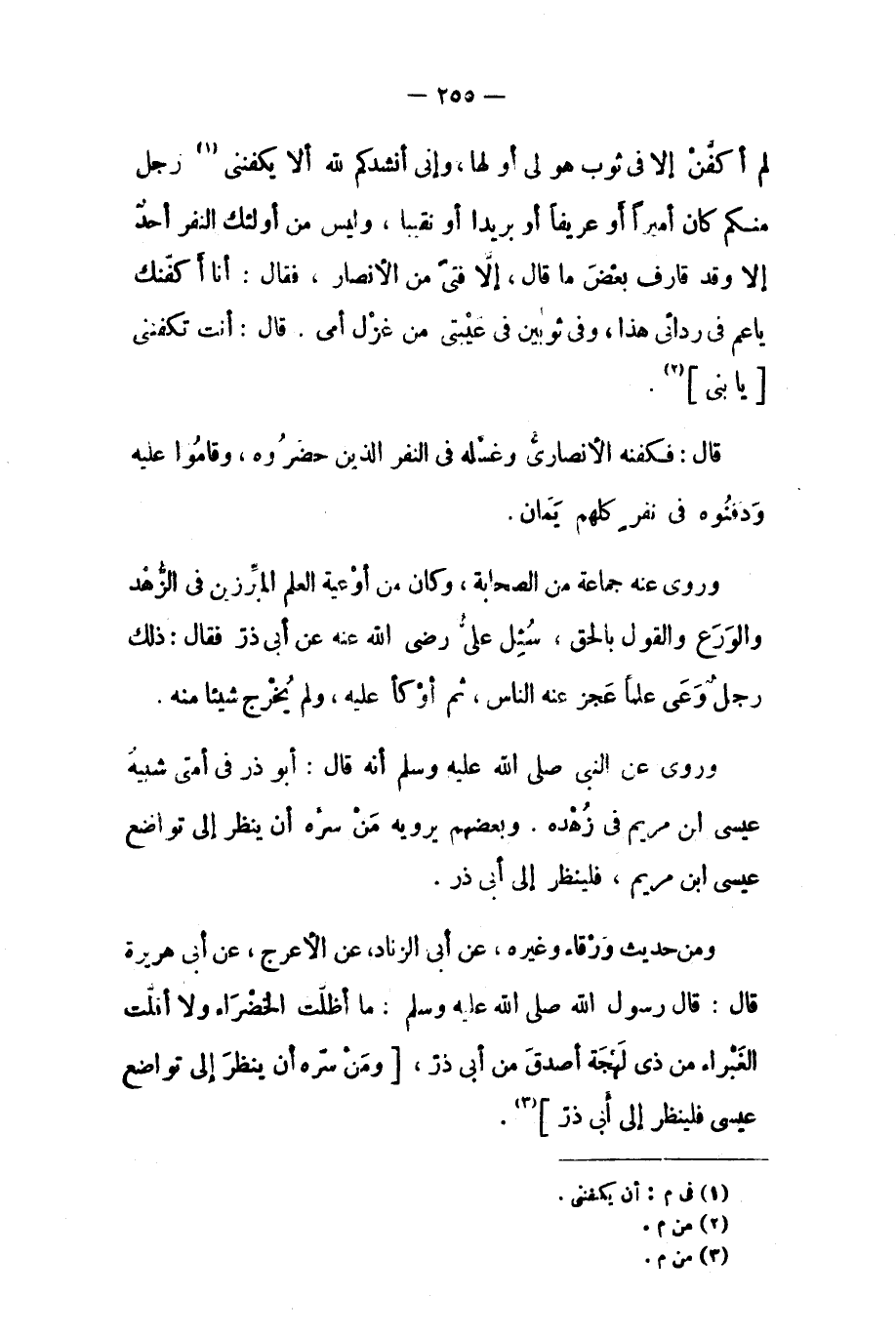 قَالَ: فَكَفَّنَهُ الأَنْصَارِيُّ وَغَسَّلَهُ فِي النَّفَرِ الَّذِينَ حَضَرُوهُ، وَقَامُوا عَلَيْهِ وَدَفَنُوهُ فِي نَفَرٍ كُلِّهِمْ يَمَانٌ. وروى عنه جماعة من الصحابة، وكان من أوعية العلم المبرزين في الزهد والورع والقول بالحق، سئل علي رضي الله عنه عن أبي ذر فقال: ذلك رجل وعى علما عجز عنه الناس، ثم أوكأ عليه، ولم يخرج شيئًا منه. وروى عن النبي صَلَّى الله عليه وَسَلَّمَ أنه قَالَ: أبو ذر في أمتي شبيه عيسى ابن مريم في زهده. وبعضهم يرويه من سره أن ينظر إلى تواضع عيسى ابن مريم، فلينظر إلى أبي ذر. ومن حديث ورقاء وغيره، عن أبي الزناد، عن الأعرج، عن أبي هريرة قَالَ: قَالَ رسول الله صلى الله عليه وسلم: ما أظلّت الخضراء ولا أفلّت الغبراء من ذي لهجة أصدق من أبي ذر، [ومن سره أن ينظر إلى تواضع عيسى فلينظر إلى أبى ذرّ] [٣] .