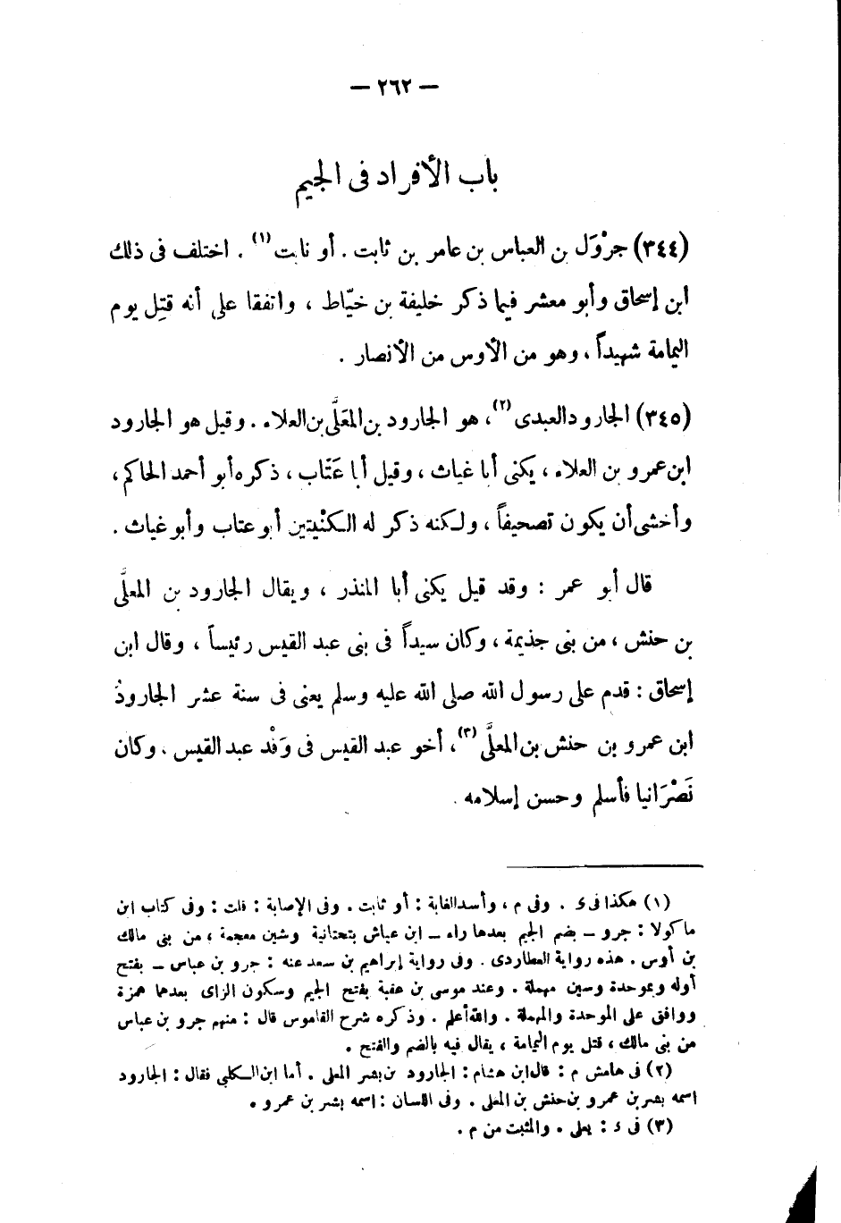 [١] هكذا في ى. وفي م، وأسد الغابة: أو ثابت. وفي الإصابة: قلت: وفي كتاب ابن ماكولا: جرو- بضم الجيم بعدها راء- ابن عياش بتحتانية وشين معجمة، من بنى مالك بن أوس. هذه رواية العطاردي. وفي رواية إبراهيم بن سعد عنه: جرو بن عباس- بفتح أوله وبموحدة وسين مهملة. وعند موسى بن عقبة بفتح الجيم وسكون الزاى بعد هما همزة ووافق على الموحدة والمهملة. والله أعلم. وذكره شرح القاموس قال: منهم جرو بن عباس من بنى مالك، قتل يوم اليمامة، يقال فيه بالضم والفتح.