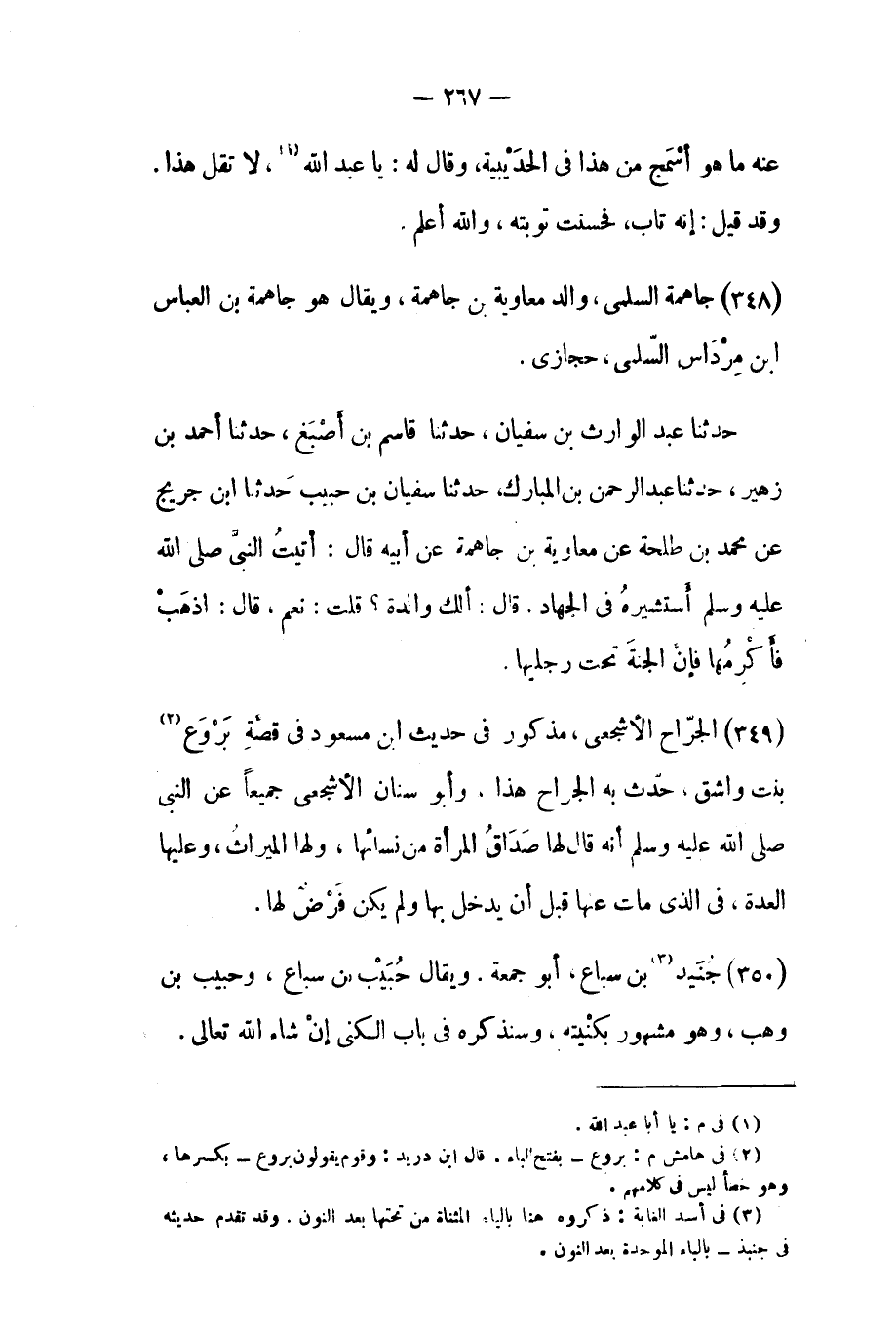 حَدَّثَنَا عَبْدُ الْوَارِثِ بْنُ سفيان، حدثنا قاسم بن أصبغ، حدثنا أحمد بْنُ زُهَيْرٍ، حَدَّثَنَا عَبْدُ الرَّحْمَنِ بْنُ الْمُبَارَكِ، حَدَّثَنَا سُفْيَانُ بْنُ حَبِيبٍ حَدَّثَنَا ابْنُ جُرَيْجٍ عَنْ مُحَمَّدِ بْنِ طَلْحَةَ عَنْ مُعَاوِيَةَ بْنِ جَاهِمَةَ عَنْ أَبِيهِ قَالَ: أَتَيْتُ النَّبِيَّ صَلَّى الله عليه وَسَلَّمَ أَسْتَشِيرُهُ فِي الْجِهَادِ. قَالَ: أَلَكَ وَالِدَةٌ؟ قُلْتُ: نَعَمْ، قَالَ: اذْهَبْ فَأَكْرِمْهَا فَإِنَّ الْجَنَّةَ تحت رجليها.