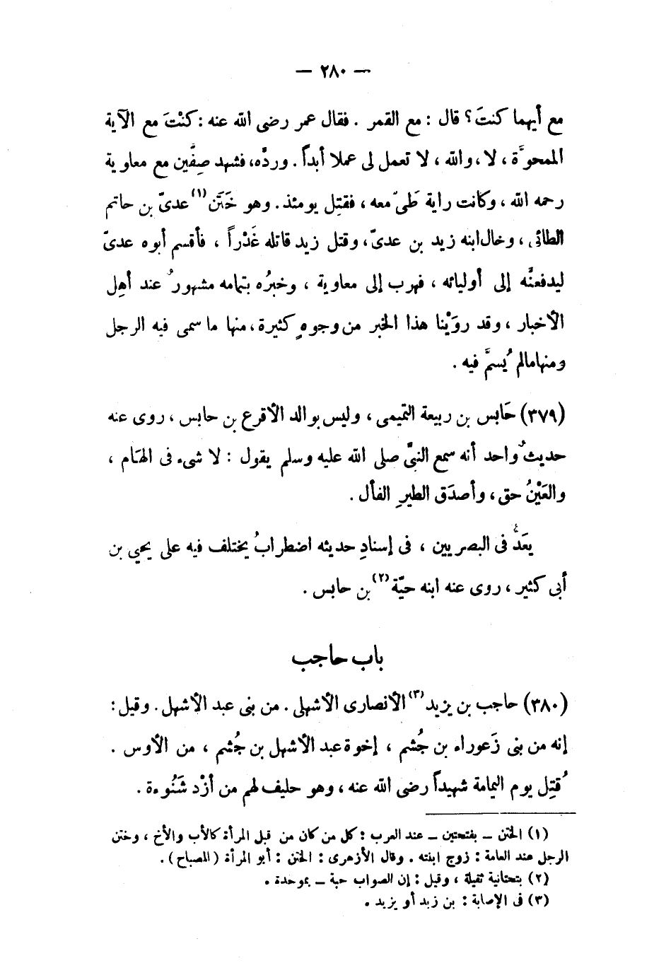 مع أيهما كنت؟ قَالَ: مع القمر. فقال عمر رضي الله عنه: كنت مع الآية الممحوة، لا، والله، لا تعمل لي عملا أبدًا. ورده، فشهد صفين مع معاوية رحمه الله، وكانت راية طىّ معه، فقتل يومئذ. وهو ختن [١] عدي بن حاتم الطائي، وخال ابنه زيد بن عدي، وقتل زيد قاتله غدرًا، فأقسم أبوه عدي ليدفعنه إلى أوليائه، فهرب إلى معاوية، وخبره بتمامه مشهور عند أهل الأخبار، وقد روينا هذا الخبر من وجوه كثيرة، منها ما سمى فيه الرجل ومنها ما لم يسم فيه.