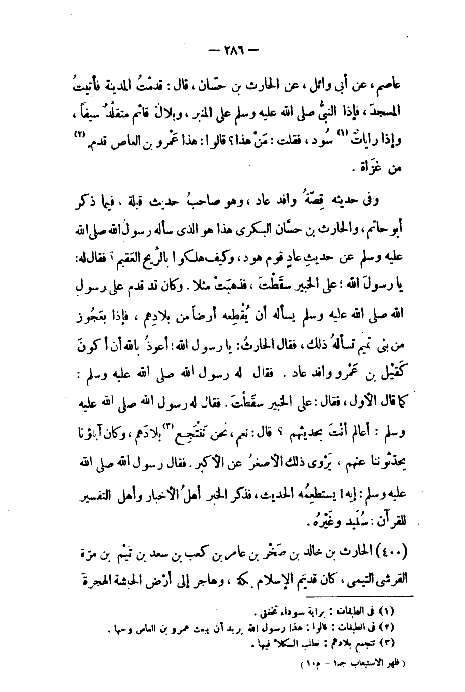 وفى حديثه قصة وافد عاد، وهو صاحب حديث قيلة، فيما ذكر أبو حاتم، والحارث بن حسان البكري هذا هو الذي سأله رسول الله صلى الله عليه وسلم عن حديث عاد قوم هود، وكيف هلكوا بالريح العقيم؟ فقال له: