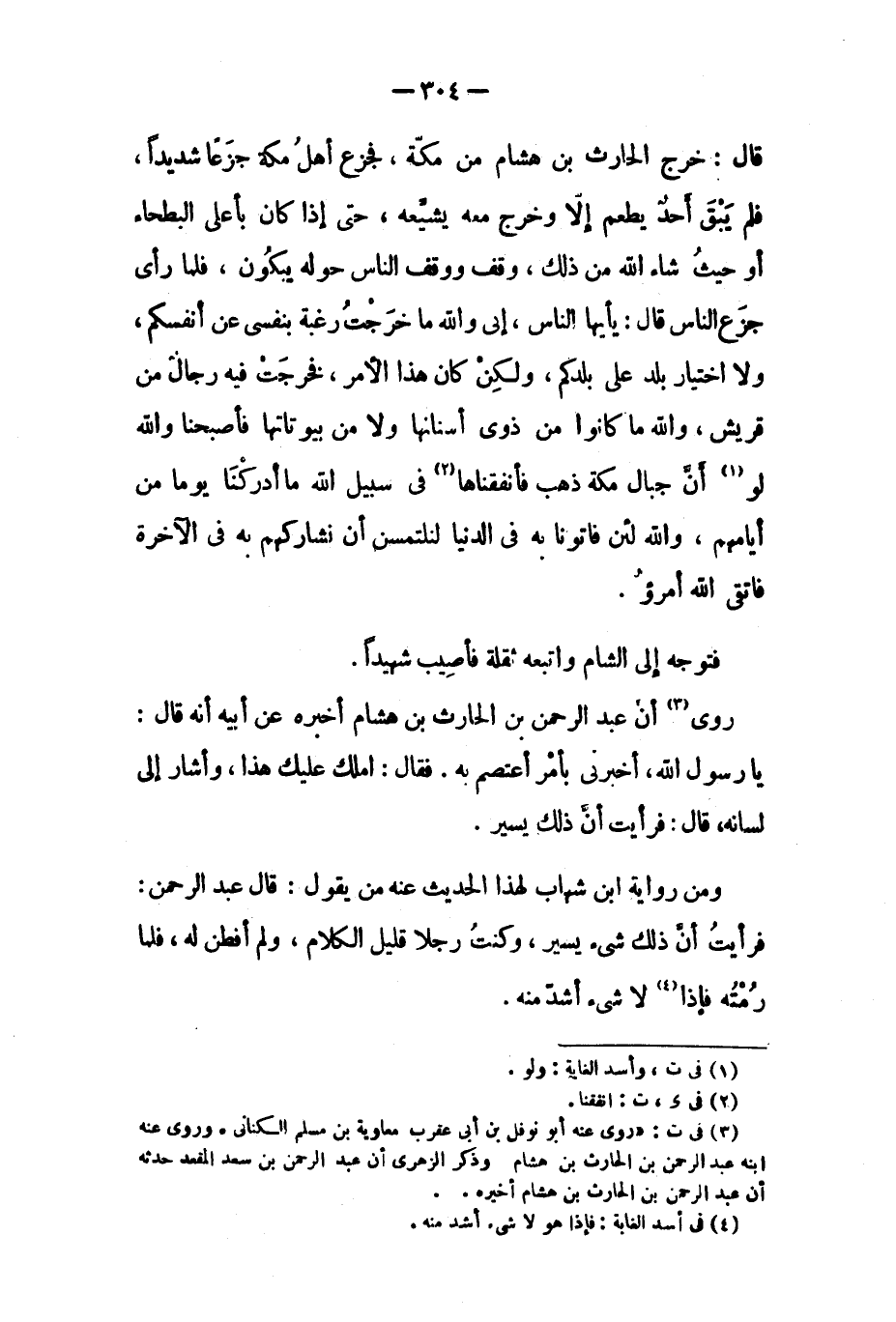 قال: خَرَجَ الْحَارِثُ بْنُ هِشَامٍ مِنْ مَكَّةَ، فَجَزِعَ أَهْلُ مَكَّةَ جَزَعًا شَدِيدًا، فَلَمْ يَبْقَ أَحَدٌ يَطْعَمُ إِلا وَخَرَجَ مَعَهُ يُشَيِّعُهُ، حَتَّى إِذَا كَانَ بِأَعْلَى الْبَطْحَاءِ أَوْ حَيْثُ شَاءَ اللَّهُ مِنْ ذَلِكَ، وَقَفَ وَوَقَفَ النَّاسُ حَوْلَهُ يَبْكُونَ، فَلَمَّا رَأَى جَزَعَ النَّاسِ قَالَ: يَا أَيُّهَا النَّاسُ، إِنِّي وَاللَّهِ مَا خَرَجْتُ رَغْبَةً بِنَفْسِي عَنْ أَنْفُسِكُمْ، وَلا اخْتِيَارَ بَلَدٍ عَلَى بَلَدِكُمْ، وَلَكِنْ كَانَ هَذَا الأَمْرُ، فَخَرَجَتْ فِيهِ رِجَالٌ مِنْ قُرَيْشٍ، وَاللَّهِ مَا كَانُوا مِنْ ذَوِي أَسْنَانِهَا وَلا مِنْ بِيُوتَاتِهَا فَأَصْبَحْنَا وَاللَّهِ لَوْ [١] أَنَّ جِبَالَ مَكَّةَ ذَهَبٌ فَأَنْفَقْنَاهَا [٢] فِي سَبِيلِ اللَّهِ مَا أَدْرَكْنَا يَوْمًا مِنْ أَيَّامِهِمْ، واللَّهِ لَئِنْ فَاتُونَا بِهِ فِي الدُّنْيَا لَنَلْتَمِسَنَّ أَنْ نُشَارِكَهُمْ بِهِ فِي الآخِرَةِ فَاتَّقَى اللَّهَ امْرُؤٌ.