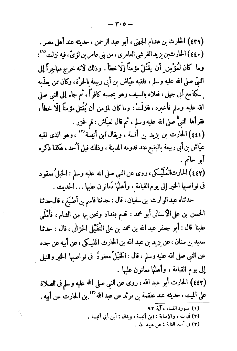 روى عن النبي صَلَّى اللَّهُ عليه وَسَلَّمَ: الخيل معقود في نواصيها الخير إلى يوم القيامة، وأهلها معانون عليها ... الْحَدِيثُ. حَدَّثَنَاهُ عَبْدُ الْوَارِثِ بْنُ سُفْيَانَ، قَالَ: حَدَّثَنَا قَاسِمُ بْنُ أَصْبَغَ، قَالَ حَدَّثَنَا الْحَسَنُ بْنُ عَلِيٍّ الأُسْتَانِيُّ أَبُو مُحَمَّدٍ: قَدِمَ بَغْدَادَ وَنَحْنُ بِهَا مِنَ الشَّامِ، فَأَمْلَى عَلَيْنَا قَالَ: أَبُو جَعْفَرٍ عَبْدُ اللَّهِ بْنُ مُحَمَّدِ بْنِ عَلِيٍّ النُّفَيْلِيُّ الْحَرَّانِيُّ، قَالَ: حَدَّثَنَا سَعِيدُ بْنُ سِنَانٍ، عَنْ يَزِيدَ بْنِ عَبْدِ اللَّهِ بْنِ الْحَارِثِ الْمُلَيْكِيِّ، عَنْ أَبِيهِ عَنْ جَدِّهِ عَنِ النبي صلى الله عليه وَسَلَّمَ، قَالَ: الْخَيْلُ مَعْقُودٌ فِي نَوَاصِيهَا الْخَيْرُ وَالنَّيْلُ إِلَى يَوْمِ الْقِيَامَةِ، وَأَهْلُهَا مُعَانُونَ عَلَيْهَا.