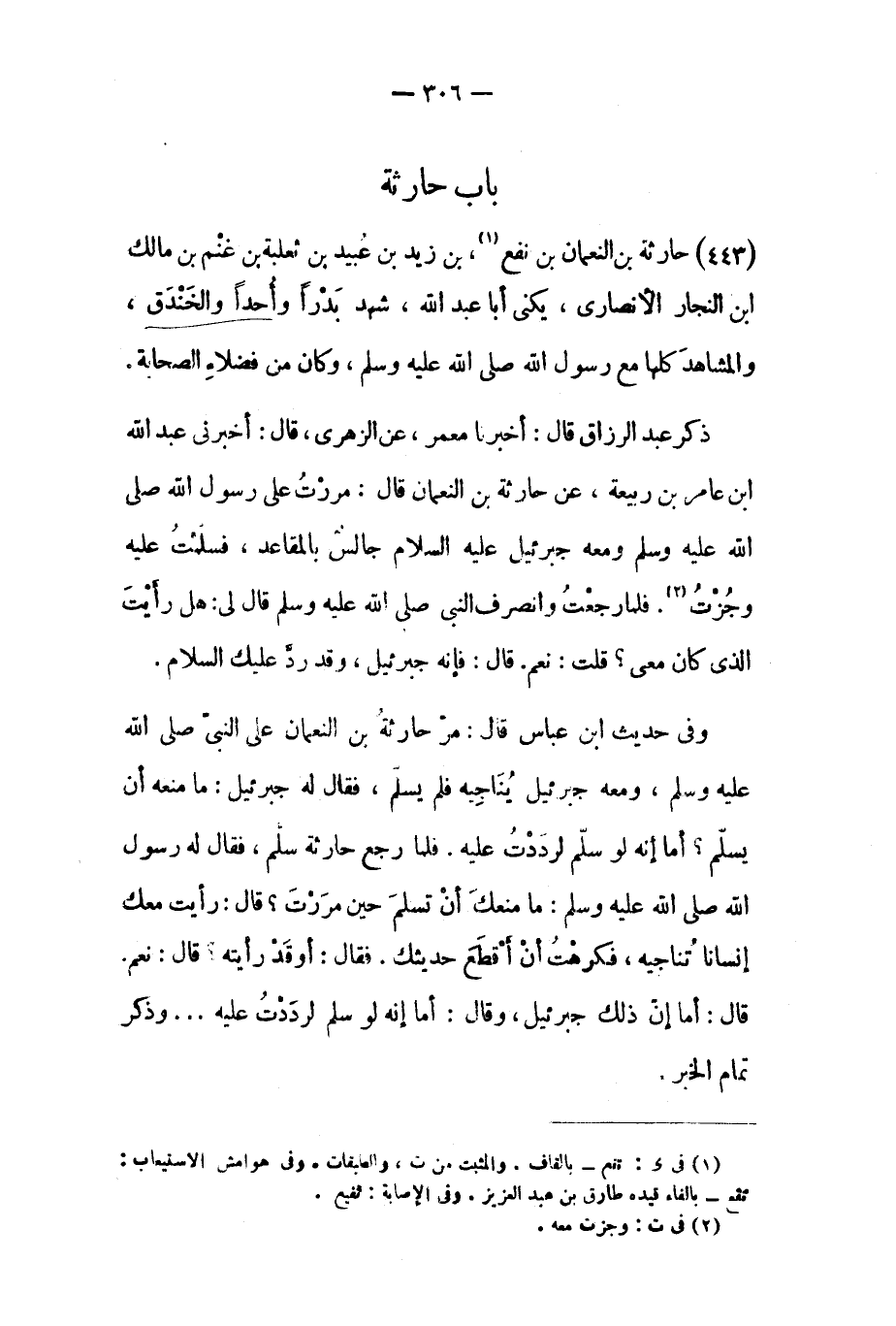 ذَكَرَ عَبْدُ الرَّزَّاقِ قَالَ: أَخْبَرَنَا مَعْمَرٌ، عَن الزُّهْرِيِّ، قَالَ: أخبرنى عبد الله ابن عَامِرِ بْنِ رَبِيعَةَ، عَنْ حَارِثَةَ بْنِ النُّعْمَانِ قَالَ: مَرَرْتُ عَلَى رَسُولِ اللَّهِ صَلَّى اللَّهُ عليه وسلم ومعه جبرئيل عَلَيْهِ السَّلامُ جَالِسٌ بِالْمَقَاعِدِ، فَسَلَّمْتُ عَلَيْهِ وَجُزْتُ [٢] . فَلَمَّا رَجَعْتُ وَانْصَرَفَ النَّبِيُّ صَلَّى اللَّهُ عَلَيْهِ وَسَلَّمَ قَالَ لِي: هَلْ رَأَيْتَ الَّذِي كَانَ معى؟ قلت: نعم. قال: فإنه جبرئيل، وَقَدْ رَدَّ عَلَيْكَ السَّلامَ. وَفِي حَديِثِ ابْنِ عَبَّاسٍ قَالَ: مَرَّ حَارِثَةُ بْنُ النُّعْمَانِ عَلَى النبيّ صلى الله عليه وسلم، ومعه جبرئيل يناجيه فلم يسلم، فقال له جبرئيل: مَا مَنَعَهُ أَنْ يُسَلِّمْ؟ أَمَا إِنَّهُ لَوْ سَلَّمَ لَرَدَدْتُ عَلَيْهِ. فَلَمَّا رَجَعَ حَارِثَةُ سَلَّمَ، فقال له رسول الله صلى الله عليه وَسَلَّمَ: مَا مَنَعَكَ أَنْ تُسَلِّمَ حِينَ مَرَرْتَ؟ قَالَ: رَأَيْتُ مَعَكَ إِنْسَانًا تُنَاجِيهِ، فَكَرِهْتُ أَنْ أَقْطَعَ حَدِيثَكَ. فَقَالَ: أَوَقَدْ رَأَيْتَهُ؟ قَالَ: نَعَمْ.
