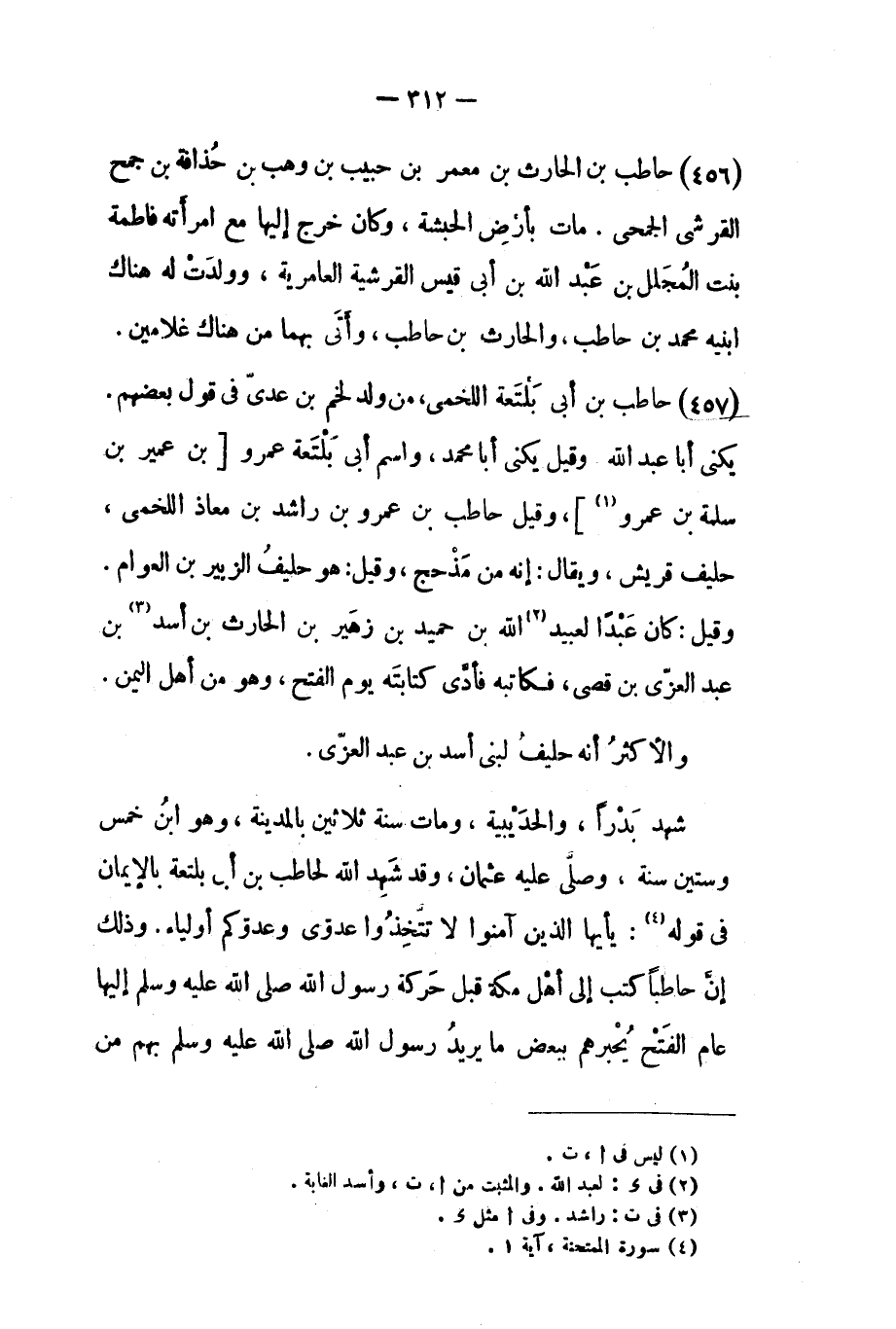 شهد بدرًا، والحديبية، ومات سنة ثلاثين بالمدينة، وهو ابن خمس وستين سنة، وصلى عليه عثمان، وقد شهد الله لحاطب بن أبي بلتعة بالإيمان في قوله [٤] : يا أَيُّهَا الَّذِينَ آمَنُوا لا تَتَّخِذُوا عَدُوِّي وَعَدُوَّكُمْ أَوْلِياءَ ٦٠: ١. وذلك إن حاطبًا كتب إلى أهل مكة قبل حركة رسول الله صَلَّى اللَّهُ عَلَيْهِ وسلم إليها عام الفتح يحبرهم ببعض ما يريد رسول الله صَلَّى اللَّهُ عليه وسلم بهم من