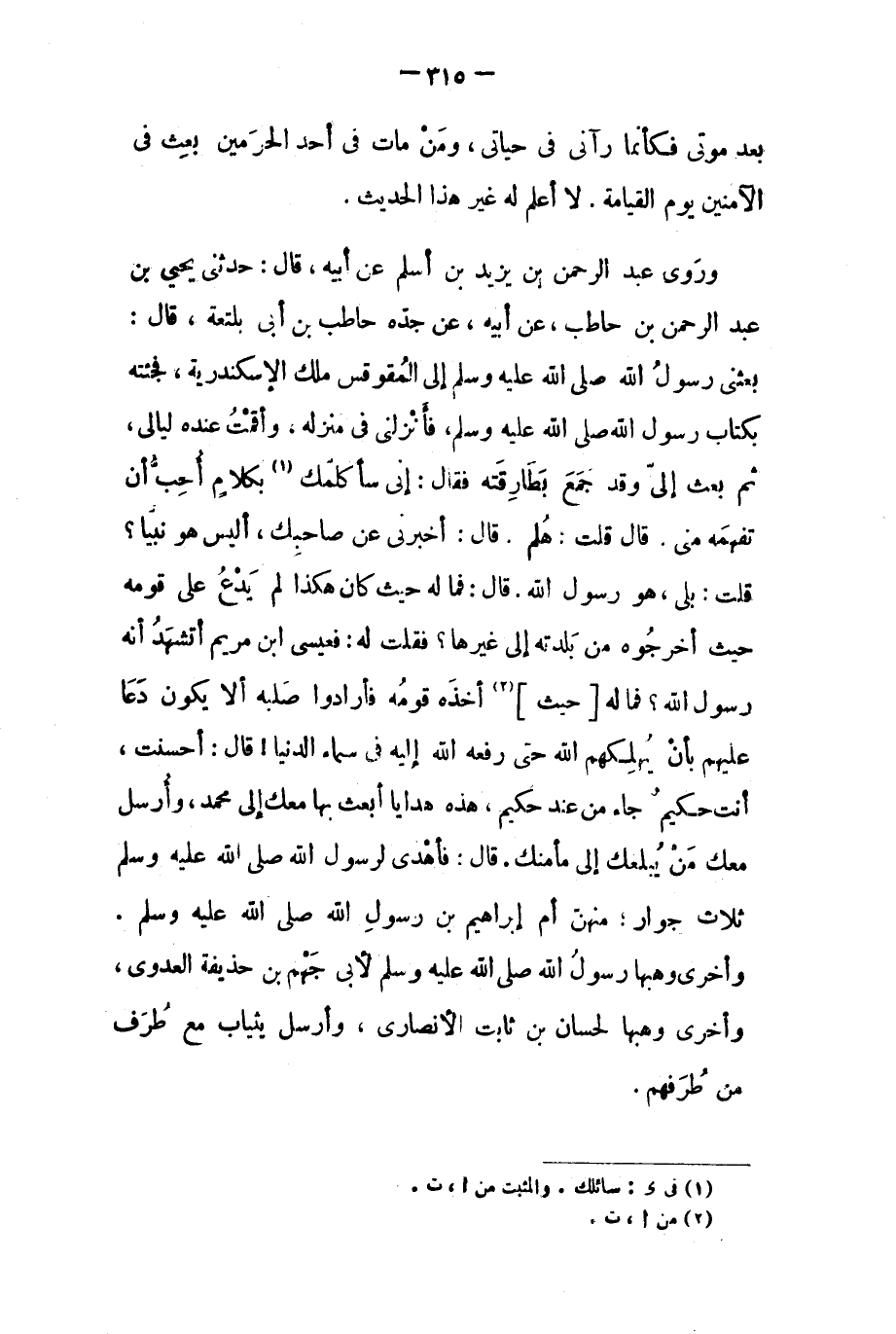 بَعَثَنِي رسول الله صلى الله عليه وسلم إلى الْمُقَوْقِسِ مَلِكِ الإِسْكَنْدَرِيَّةِ، فَجِئْتُهُ بِكِتَابِ رَسُولِ اللَّهِ صلى الله عليه وسلم، فأنزلنى في منزله، وأقمت عنده ليالي، ثُمَّ بَعَثَ إِلَيَّ وَقَدْ جَمَعَ بَطَارِقَتَهُ فَقَالَ: إِنِّي سَأُكَلِّمُكَ [١] بِكَلامٍ أُحِبُّ أَنْ تَفْهَمَهُ مِنِّي. قَالَ قُلْتُ: هَلُمَّ. قَالَ: أَخْبِرْنِي عَنْ صَاحِبِكَ، أَلَيْسَ هُوَ نَبِيًّا؟