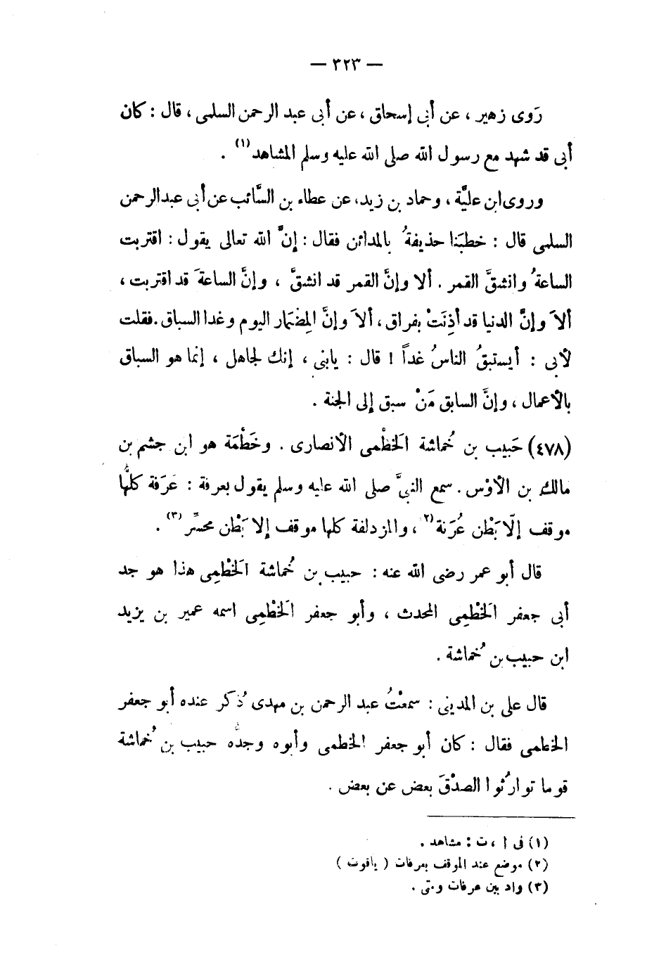 وَرَوَى ابْنُ عُلَيَّةَ، وَحَمَّادُ بْنُ زَيْدٍ، عَنْ عَطَاءِ بْنِ السَّائِبِ عَنْ أَبِي عَبْدِ الرَّحْمَنِ السُّلَمِيِّ قَالَ: خَطَبَنَا حُذَيْفَةُ بِالْمَدَائِنِ فَقَالَ: إِنَّ اللَّهَ تَعَالَى يَقُولُ: اقْتَرَبَتِ السَّاعَةُ وَانْشَقَّ الْقَمَرُ. ٥٤: ١ أَلا وَإِنَّ الْقَمَرَ قَدِ انْشَقَّ، وَإِنَّ السَّاعَةَ قَدِ اقْتَرَبَتْ، أَلا وَإِنَّ الدُّنْيَا قَدْ أَذِنَتْ بِفِرَاقٍ، أَلا وَإِنَّ الْمِضْمَارَ الْيَوْمَ وَغَدًا السِّبِاقُ. فَقُلْتُ لأَبِي: أَيَسْتَبِقُ النَّاسُ غَدًا! قَالَ: يَا بُنَيَّ، إِنَّكَ لَجَاهِلٌ، إِنَّمَا هُوَ السِّبَاقُ بِالأَعْمَالِ، وَإِنَّ السَّابِقَ مَنْ سَبَقَ إِلَى الْجَنَّةِ.