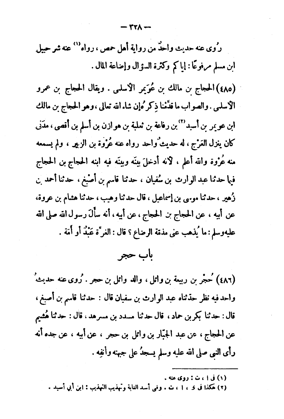 ويقال الحجاج بن عمرو الأسلمي. والصواب ما قدمنا ذكره إن شاء الله تعالى، وهو الحجاج بن مالك ابن عويمر بن أسيد [٢] بن رفاعة بن ثعلبة بن هوازن بن أسلم بن أقصى، مدني كان ينزل العرج، له حديث واحد رواه عنه عروة بن الزبير، ولم يسمعه منه عروة والله أعلم، لأنه أدخل بينه وبينه فيه ابنه الحجاج بن الحجاج فيما حَدَّثَنَا عَبْد الوارث بن سفيان، حدثنا قاسم بن أصبغ، حدثنا أحمد بن زهير، حدثنا موسى بن إسماعيل، قال حدثنا وهيب، حدثنا هشام بن عروة، عن أبيه، عن الحجاج بن الحجاج، عن أبيه، أنه سأل رسول الله صلى الله عليه وسلم: ما يذهب عنى مذمة الرضاع؟ قَالَ: الغرة عَبْد أو أمة.