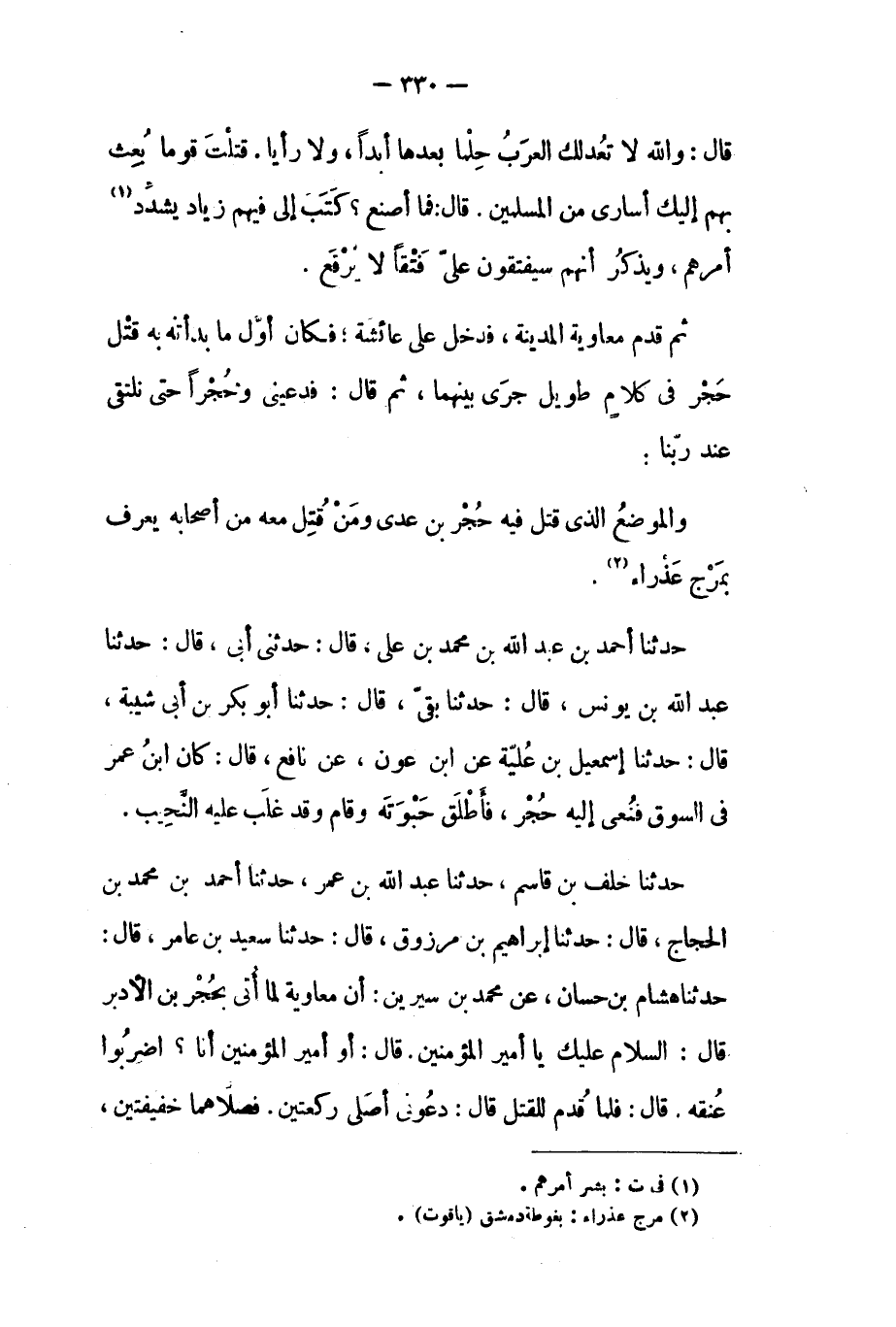 حَدَّثَنَا هِشَامُ بْنُ حَسَّانٍ، عَنْ مُحَمَّدِ بْنِ سِيرِينَ: أَنَّ مُعَاوِيَةَ لَمَّا أُتِيَ بِحُجْرِ بْنِ الأَدْبَرِ قَالَ: السَّلامُ عَلَيْكَ يَا أَمِيرَ الْمُؤْمِنِينَ. قَالَ: أَوَ أَمِيرُ الْمُؤْمِنِينَ أنا؟ اضْرِبُوا عُنُقَهُ. قَالَ: فَلَمَّا قُدِّمَ لِلْقَتْلِ قَالَ: دعوني أصلى ركعتين. فصلّاهما خفيفتين،