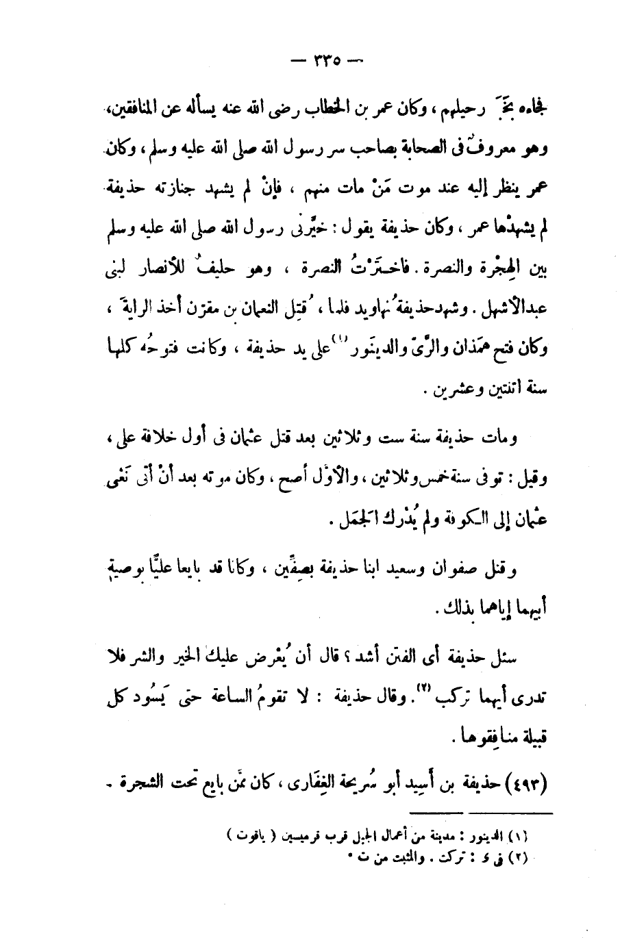 فجاءه بخبر حيلهم، وكان عمر بن الخطاب رضي الله عنه يسأله عن المنافقين، وهو معروف في الصحابة بصاحب سر رسول الله صَلَّى اللَّهُ عَلَيْهِ وَسَلَّمَ، وكان عمر ينظر إليه عند موت من مات منهم، فإن لم يشهد جنازته حذيفة لم يشهدها عمر، وكان حذيفة يقول: خيّرني رسول الله صلى الله عليه وسلم بين الهجرة والنصرة. فاخترت النصرة، وهو حليف للأنصار لبني عبد الأشهل. وشهد حذيفة نهاويد فلما، قتل النعمان بن مقرن أخذ الراية، وكان فتح همذان والري والدينور [١] على يد حذيفة، وكانت فتوحه كلها سنة اثنتين وعشرين.