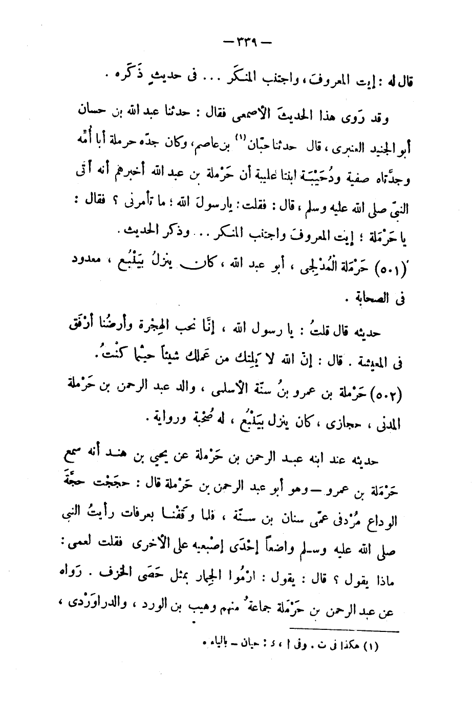وَقَدْ رَوَى هَذَا الْحَدِيثَ الأَصْمَعِيُّ فَقَالَ: حَدَّثَنَا عَبْدُ اللَّهِ بْنُ حَسَّانٍ أَبُو الْجُنَيْدِ الْعَنْبَرِيُّ، قَالَ حَدَّثَنَا حِبَّانُ [١] بْنُ عَاصِمٍ، وَكَانَ جَدُّهُ حَرْمَلَةُ أَبَا أُمِّهِ وَجَدَّتَاهُ صَفِيَّةُ وَدُحَيْبَةُ ابْنَتَا عُلَيْبَةَ أَنَّ حَرْمَلَةَ بْنَ عَبْدِ اللَّهِ أَخْبَرَهُمْ أَنَّهُ أَتَى النَّبِيَّ صَلَّى اللَّهُ عليه وَسَلَّمَ، قَالَ: فَقُلْتُ: يَا رَسُولَ اللَّهِ، مَا تَأْمُرُنِي؟ فَقَالَ: